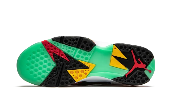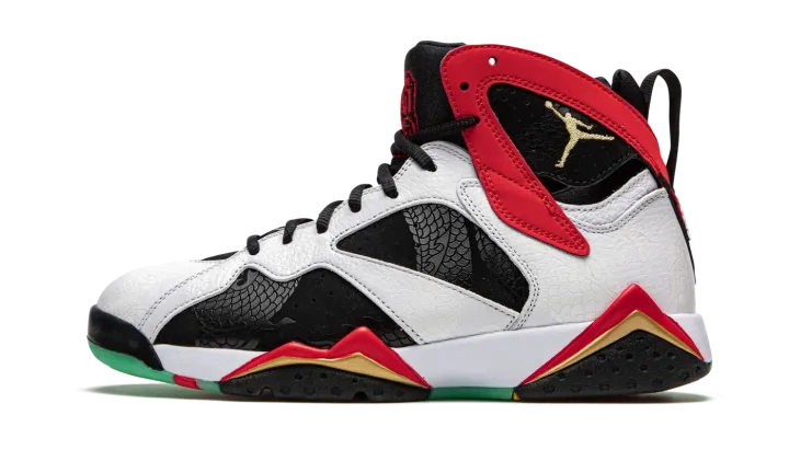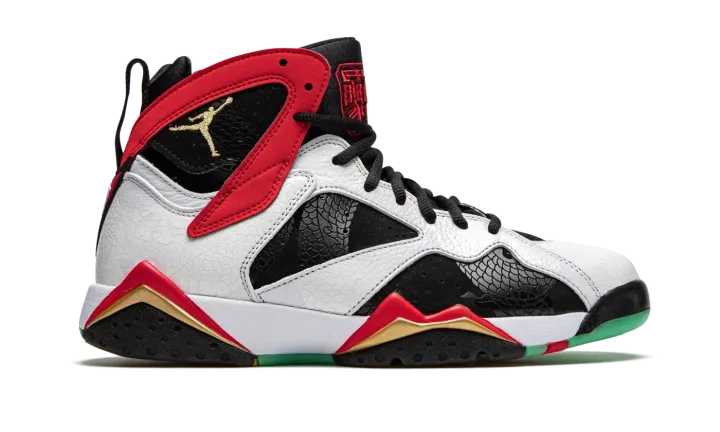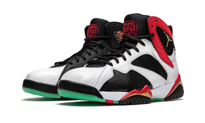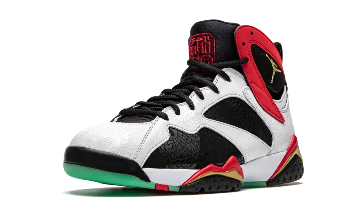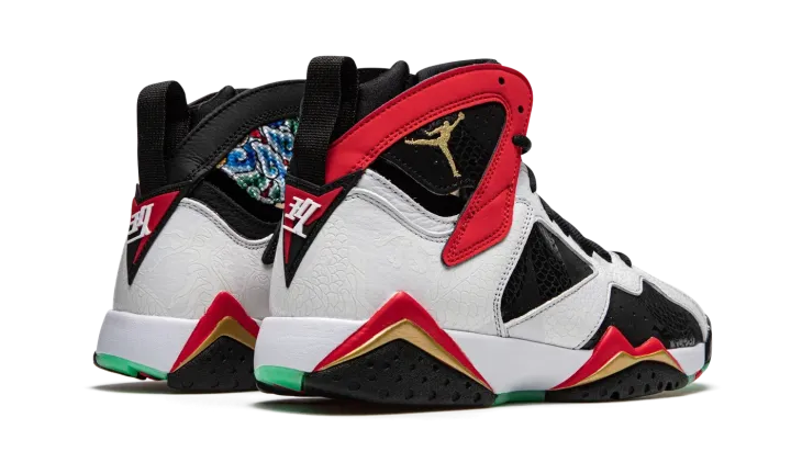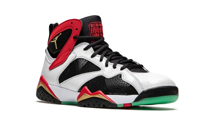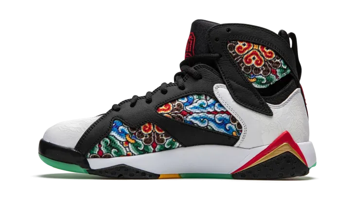 The Air Jordan 7 "Greater China" is a special colorway of Michael Jordan's seventh signature shoe that honors China's passion for the game of basketball. The "Greater China" also salutes the country's appreciation for Jordan's signature shoe collection, which has been a fixture in China's streetwear scene for decades. As for the look of this shoe, overtures to traditional Chinese culture appear throughout the design. Patterns reminiscent of dragon scales can be found on the detailing of the black nubuck material that appears on the mid-panel and forefoot. The scales are lasered into the white leather overlays found on the toe, eyelets, and heel. Both the heel and tongue feature Chinese characters in white and red embroidery, respectively. Jordan Brand incorporates a gold embroidered Jumpman on the outside of the collar while placing traditional Chinese patterns on the medial side to complete the look. Release date: September 5, 2020.