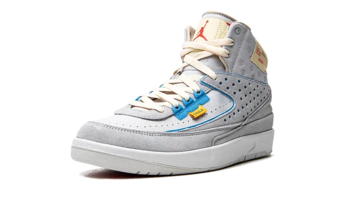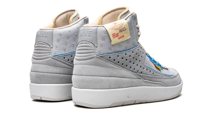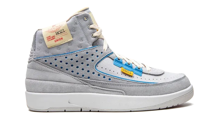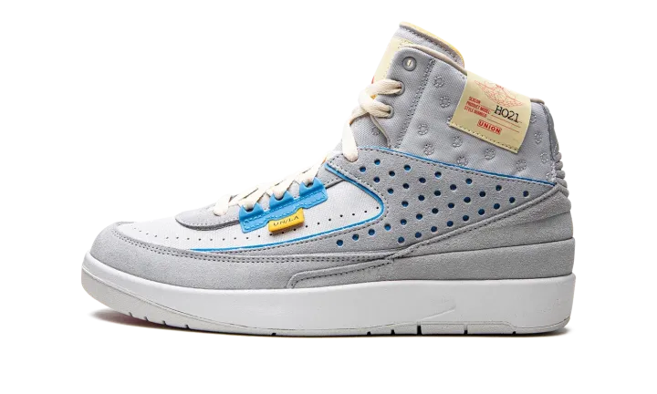 The Union x Air Jordan 2 "Grey Fog" is one of two colorways of Michael Jordan's second signature shoe designed by Chris Gibbs and the Los Angeles based fashion boutique. Union's collaboration with Jordan Brand on the Air Jordan 2 honors the vintage basketball shoe's legacy with retro-modern design modifications that progress its timeless look. Released alongside the "Rattan" colorway, Union's "Grey Fog" Jordan 2 is complete with a light grey nylon and suede upper. Light blue piping along the upper is reminiscent of the blue accenting found on Carmelo Anthony's former Player Exclusive Air Jordan 2 colorway that received a retail release in 2004 and 2019. A yellow nylon tag with "UNION LA" branding is found beneath the blue eyelets on the lateral side of the shoe. Additional branding appears in the form of a retro-style "Union" identification label on the collar and red Jumpman and "Union LA" branding on the tongue. Cream-colored laces give the shoe a vintage look.