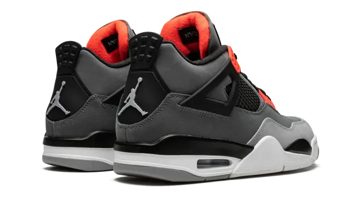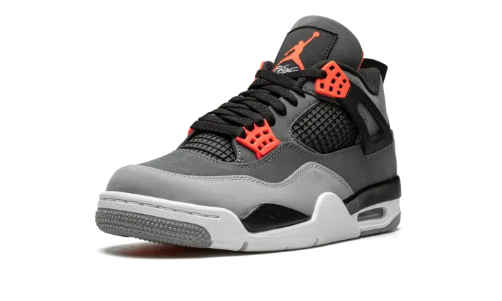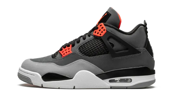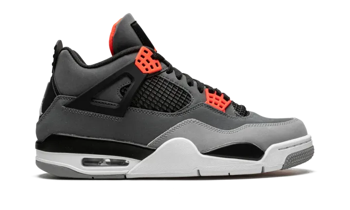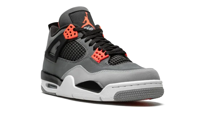 The Air Jordan 4 "Infrared" is a February 2021 release of the vintage basketball shoe in a colorway loosely inspired by the Chicago Bulls, Michael Jordan's former basketball team. The "Infrared" Jordan 4 also mimics the color block of the model's "Green Glow" colorway from 2013, trading the latter's green accents for Infrared. The shoe features a synthetic nubuck upper in light and dark grey. Black accenting can be found on the netting found on the tongue and mid-panel, on the "wings," and inner lining. Lighter shades of grey appear on the toe and outsole. A light grey Jumpman is located on the black heel counter and an Infrared Jumpman is printed on the black nylon tongue tag on the tongue. Additional Infrared detailing is found on the eyelets. Underfoot, a visible Air bubble in the white midsole completes the look. Release date: February 8, 2022