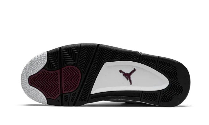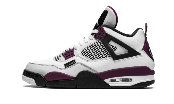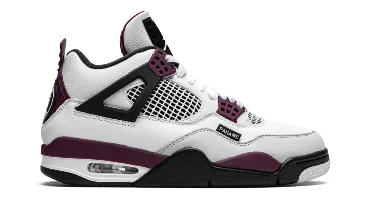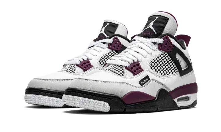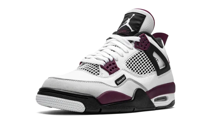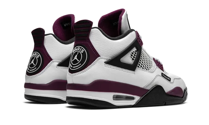The Air Jordan 4 PSG "Paris Saint Germain" is a desirable collaboration between the European football club and Jordan Brand on Michael Jordan's fourth signature shoe. Paris Saint Germain, or simply "PSG," has received special colorways of classic Air Jordans since inking a sponsorship deal with Jordan Brand in 2018. The upper features smooth white leather on the mudguard, which spans from the heel to the toe. Tumbled white leather can be found around the eyelets, collar, and heel. Subtle light grey nubuck detailing is located on the toe. White netting is layered over a black synthetic material on the tongue and mid-panel. Bordeaux accenting comes into play on the plastic lace holders and midsole walls. The burgundy hue can also be found on the underside of the tongue and on the heel. Dual "Paris Saint Germain" and Jumpman detailing dots the heel, while an added "Paname" (another word for Paris) tab is found near the toe. Release date: October 10, 2020.