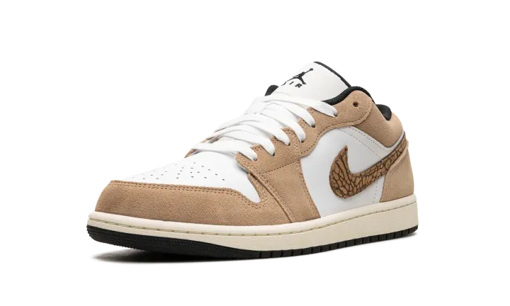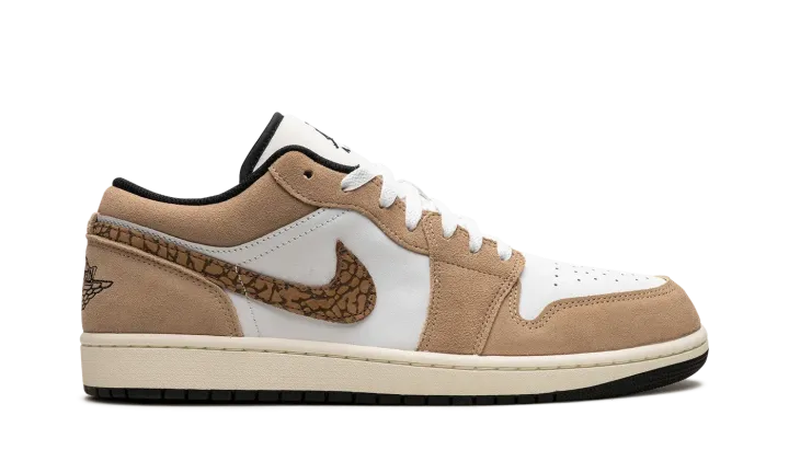 The Air Jordan 1 Low SE "Brown Elephant" is a colorway of the retro basketball shoe in low-top form with classic elephant print on its design. The "Brown Elephant" colorway of the always-popular Jordan 1 Low features a white leather base with tan suede overlays. The Swoosh on the sides has been designed in brown elephant print, a classic pattern that first appeared on the Air Jordan 3 way back in 1988. As for the rest of the shoe, a "Wings" logo is embroidered on the heel and a Jumpman is seen on the tongue. An aged midsole and brown rubber outsole complete the look. Release date: July 20, 2023