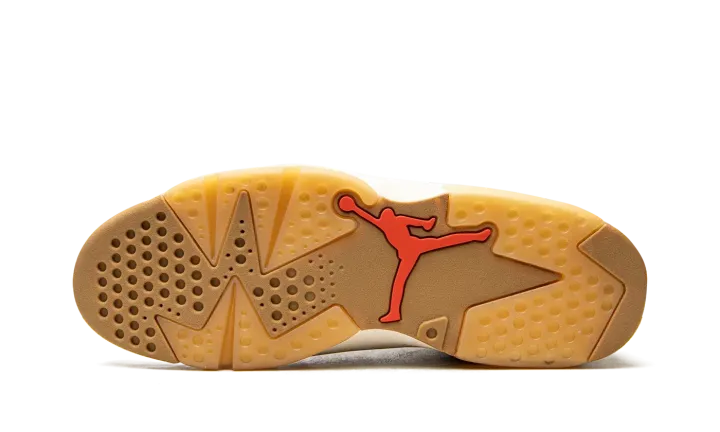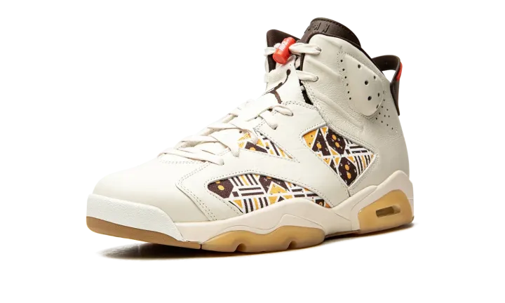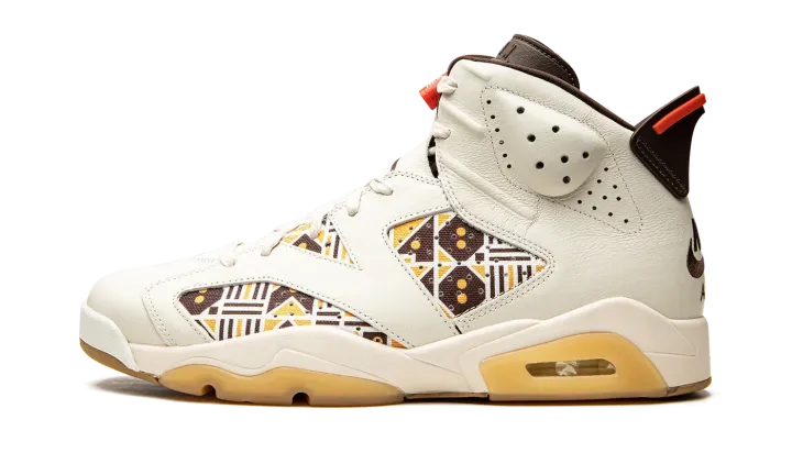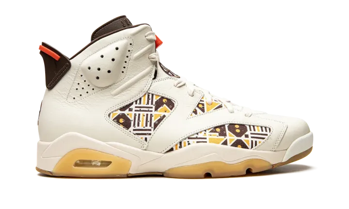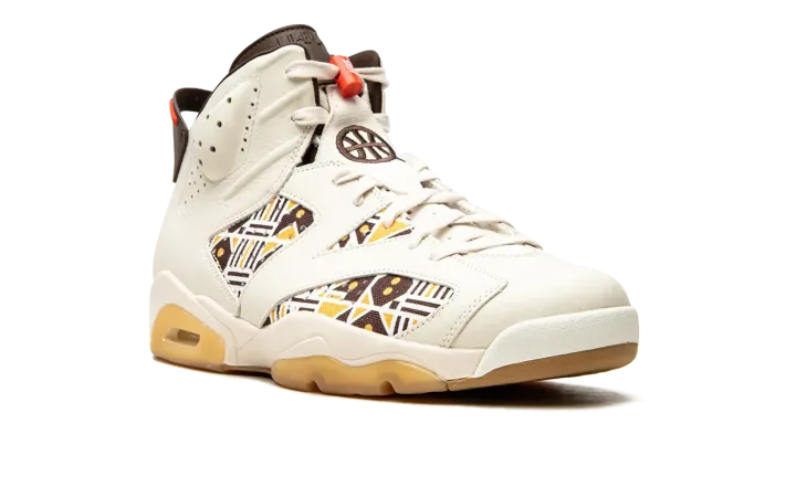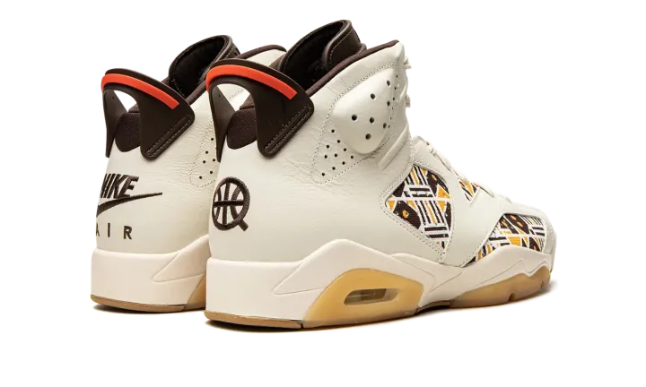 The Air Jordan 6 "Quai 54" is one of two colorways released by Jordan Brand in 2020 that coincides with the annual streetball tournament in Paris, France. Both colorways of Michael Jordan's beloved sixth signature shoe display a Sail leather base with patterned textile underlaid panels on either side. This version features an orange and maroon multidirectional motif within the aforementioned design found on the mid-panel. Brown embroidered Jumpman branding can be found on the cream colored nylon overlay on the tongue. The red lace toggle features a white Jumpman logo and co-branded "Nike Air" and "Quai 54" embroidery graces the left and right heel, respectively. Release date: August 8, 2020.
