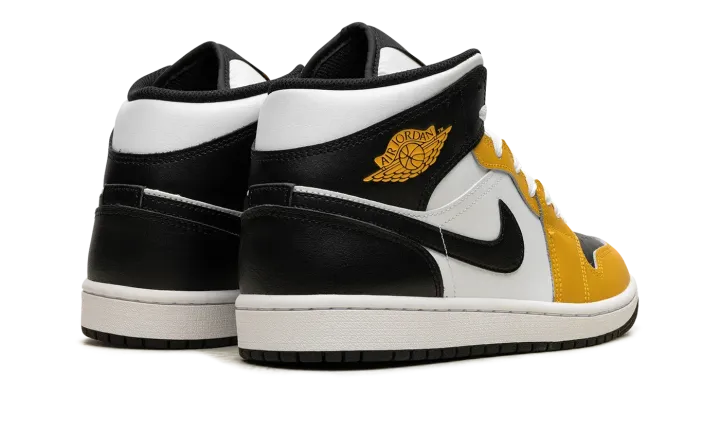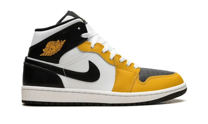 The Air Jordan 1 Mid "Yellow Ochre" is a colorway of the casual shoe with yellow accents. The attention-seeking "Yellow Ochre" Jordan 1 Mid features a combination of black, white, and yellow leather panels. More specifically, the shoe has a black leather perforated toe with a black leather collar and heel. Yellow Ochre leather is seen on the toe cap, forefoot, and eyelet panels. A black leather Swoosh appears on either side of the white leather mid-panel and a yellow "Wings" logo is found on the collar. Yellow Ochre-colored Jumpman and "Air" logos are seen on the tongue. Underfoot, a white rubber midsole and black rubber outsole complete the look.
