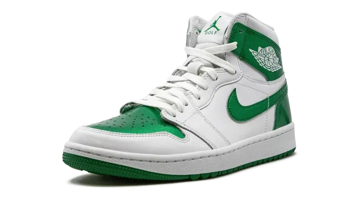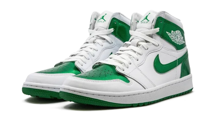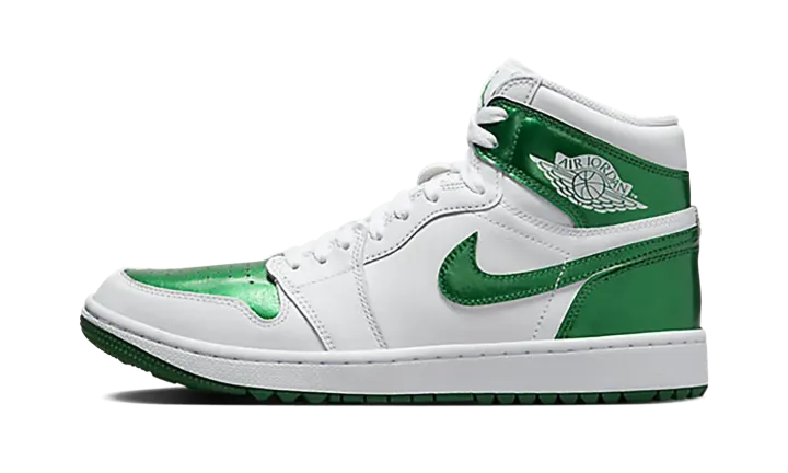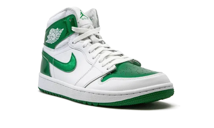 The Air Jordan 1 High Golf "Metallic Green" is an alternate version of the classic basketball sneaker designed for golf in a can't-miss colorway. The Jordan 1 High Golf mimics the styling of the standard Air Jordan 1 High OG model, but with subtle updates made specifically for the fairway. The "Metallic Green" colorway features a white leather construction, save for flashy Metallic Green leather on the perforated toe, collar, heel, and Swoosh. A classic "Wings" logo appears on the collar while green Jumpman and "Golf" branding are found on the tongue tag. Underfoot, the "Metallic Green" Jordan 1 High Golf features small nubs on the outsole that provide traction on a golf course. Release date: April 28, 2023