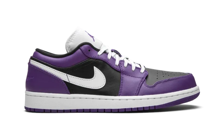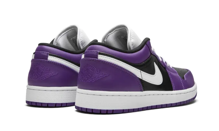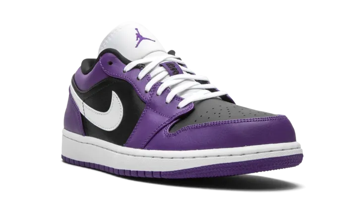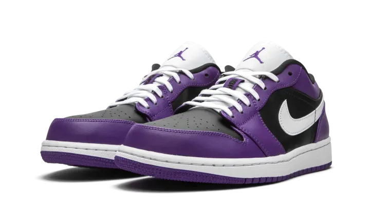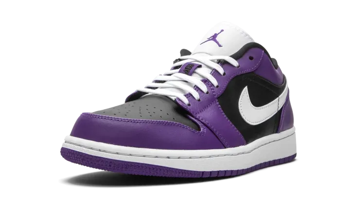 The Air Jordan 1 Low "Court Purple" finds Michael Jordan's first signature shoe in low-top form in a decidedly regal colorway. Versatile as any Jordan 1 Low on the market, the "Court Purple" features a predominately two-tone color block of a black leather base visible on the perforated toe and mid-panel. Court Purple leather accenting can be found on the forefoot, eyelets, collar, and heel. White cotton laces, a white nylon tongue, and white leather Swoosh detailing on either side breaks up the dark appearance of the upper. A purple Jumpman insignia dots the tongue and tonal "Wings" embroidery is located on the heel.