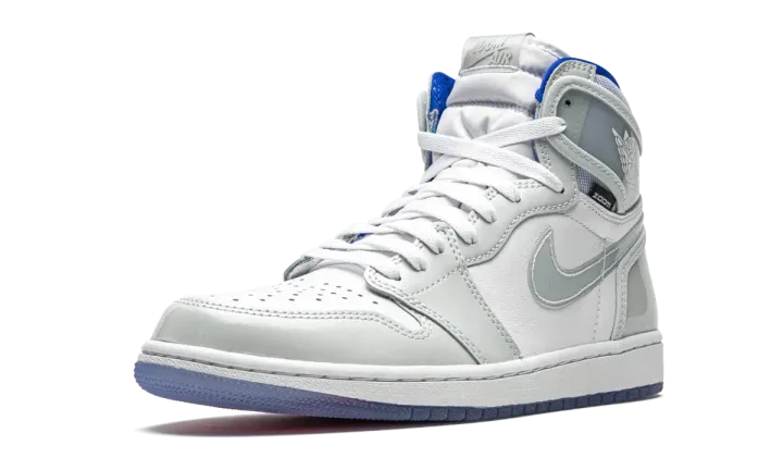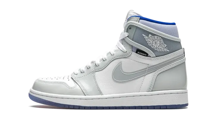 The Air Jordan 1 High Zoom "Racer Blue" adds upgraded cushioning and a sleek color scheme to Michael Jordan's first signature shoe. The clean construction includes a perforated toe area done up in white leather that is contrasted by light grey patent leather overlays on the forefoot, eyelets, and heel. The collar, side Swooshes, and heel panel all feature a clear synthetic material. Blue accenting is found on the liner. A icy blue outsole with a red-to-blue gradient visible underneath completes the striking colorway. Release date: March 14, 2020.