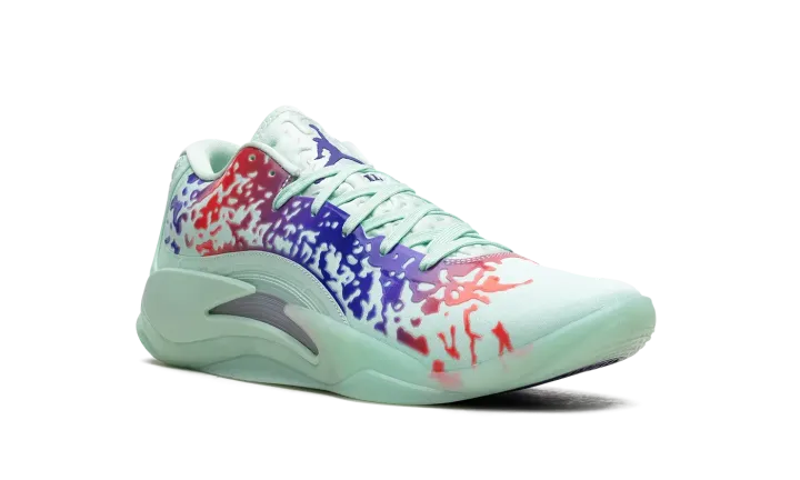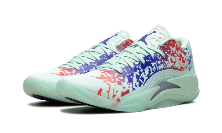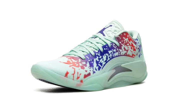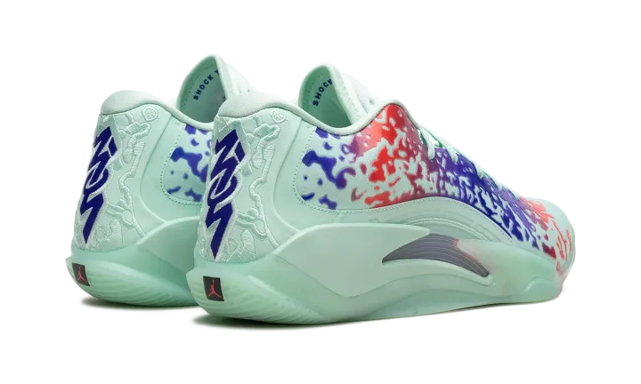 The Jordan Zion 3 "Mud, Sweat, and Tears" is a unique and eye-catching colorway of Zion Williamson's third signature shoe with Jordan Brand. Inspired by Zion's dedication to his craft on the hardwood, the "Mud, Sweat, and Tears" colorway is complete with a light green textile base contrasted with red and blue accents on the sides. A purple Jumpman logo can be seen on either side of the shoe while "Zion" detailing can be found on the heel. The shoe features a drop-in, Zoom Air cushioned unit in the midsole made of Formula 23 foam. Release date: October 18, 2023
