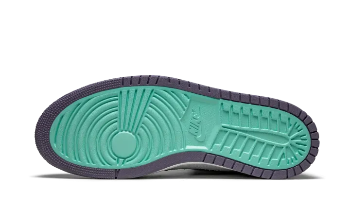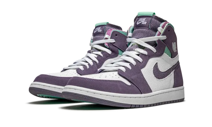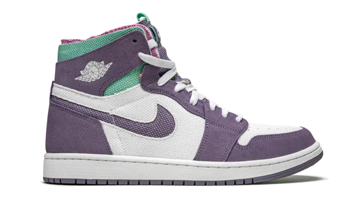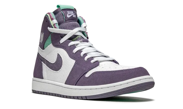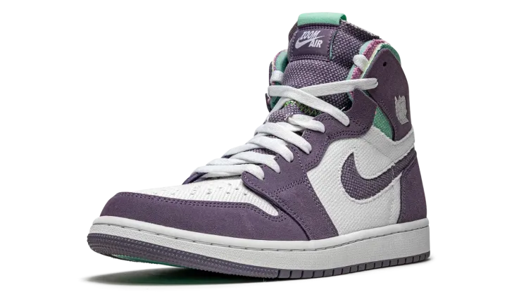 The Air Jordan 1 High Zoom CMFT "Tropical Twist" is a warm weather inspired look for the alternate, contemporary edition of Michael Jordan's first signature shoe. Introduced in 2020, the Jordan 1 Zoom CMFT (comfort) is an evolution of the retro basketball shoe that displays a deconstructed style influenced by Off-White's Air Jordan 1 collaboration from 2017. Additionally, the Zoom CMFT features even more padding around the collar. Here, the "Tropical Twist" displays purple suede detailing on the various panels that contrast the white canvas base. A purple Swoosh appears on both sides and a white "Wings" can be found on the collar. Teal-colored canvas graces the exposed foam collar. A "Zoom Air" tongue tag replaces the original "Nike Air" branded version that appears on the original Air Jordan 1. The midsole features Zoom Air cushioning, a deviation from the standard Air unit found in the original Air Jordan 1 High OG.
