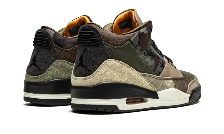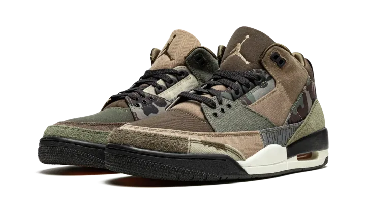 The Air Jordan 3 "Patchwork Camo" is a November 2021 release of Michael Jordan's third signature shoe in a colorway that features three different types of camouflage print. The classic basketball shoe displays "rain," "leaf," and "woodland" camo patterns on multiple overlays on its design, a first for the Jordan 3. The left and right shoes feature various earth-tone colors and camo panels in a mismatched design. A velcro-style "Nike Air" patch can be added or removed from the heel. The unique Jordan 3 is completed with a white midsole and a black outsole with orange accents. Release date: November 29, 2021