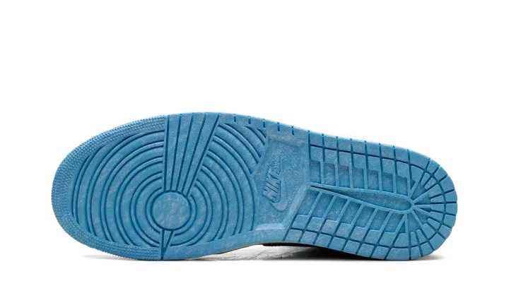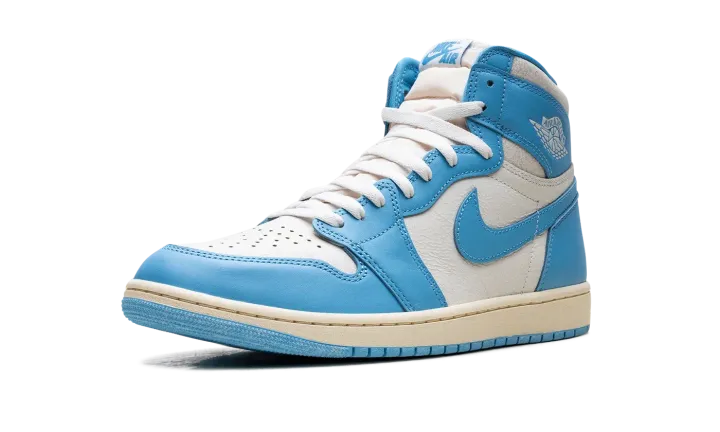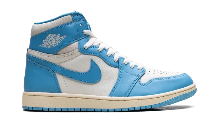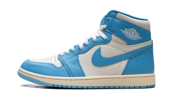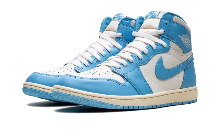 The Air Jordan 1 High "UNC Reimagined" offers a fresh look at Michael Jordan's first signature shoe. The UNC AJ1 adds the Reimagined design cues to the high top Jordan 1 that honors MJ's alma mater, the University of North Carolina. Featuring a crisp Carolina blue and white upper, the "UNC Reimagined" Jordan 1 has vintage details like an off-white midsole and cracked leather around the ankle.