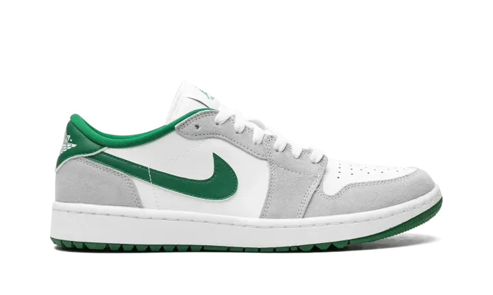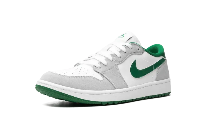 The Air Jordan 1 Low Golf "Pine Green" is a colorway of the golf shoe with green details. Inspired by the Jordan 1 Low, the Jordan 1 Low Golf features nubs on the outsole that provide traction on the fairway. As for the colorway at hand, the shoe features a white leather upper with Light Smoke Grey suede overlays. A Pine Green leather Swoosh appears on the sides, while more Pine Green detailing can be found on the inner lining, and Jumpman and "Golf" logos on the tongue. Underfoot, a white rubber midsole and Pine Green rubber outsole with a golf-specific traction pattern complete the look. Release date: March 22, 2024