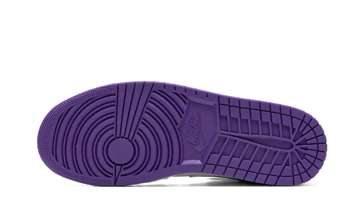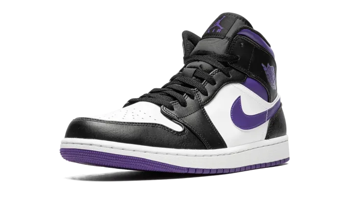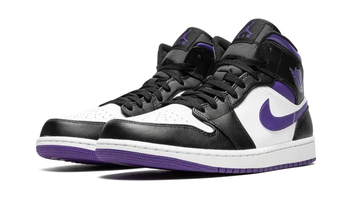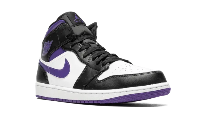 The Air Jordan 1 Mid "Dark Iris" is a colorway of the mid-top version of Michael Jordan's first signature shoe that unofficially shows love to the Sacramento Kings. Dressed in the basketball team's black, white, and purple team uniform colors, the "Dark Iris" is in no way affiliated with the Kings, but brings to mind all of the great Player Exclusive Air Jordan colorways worn by former Kings players and Team Jordan members Mike Bibby and Mitch Richmond. The shoe features a white perforated leather toe and mid-panel. Contrasting black leather overlays appear on the forefoot, eyelets, collar, and heel. A Dark Iris leather Swoosh is found on the sides. The purple hue also appears on the "Wings" logo, on the collar, and on the Jumpman and "Air" branding on the tongue tag.