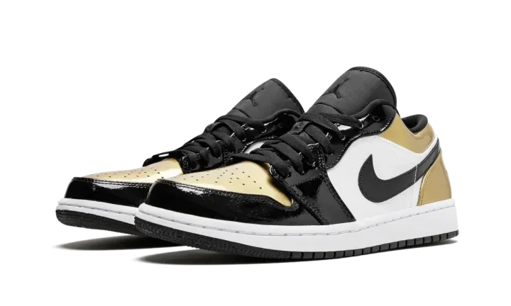 The Air Jordan 1 Low "Gold Toe" is a special release of the low-top Jordan 1 that borrows a popular colorway from the original high-top. The metallic gold, white, and black patent leather construction that first appeared on the Jordan 1 High in 2018 is mirrored on this Jordan 1 Low from 2019. Unlike the high-top's asymmetrical color blocking, this low features the same look on the lateral and medial sides. Each pair is completed with a tonal Jumpman logo embroidered on the tongue and the classic "wings" logo on the heel. The Air Jordan 1 Low "Gold Toe" released during the summer of 2019.