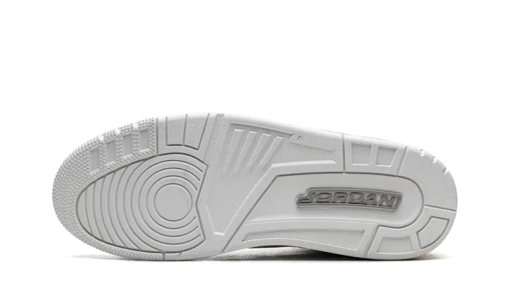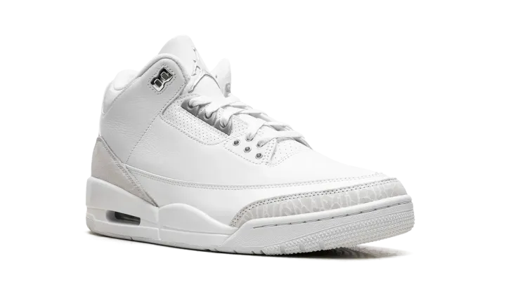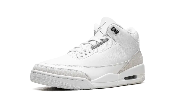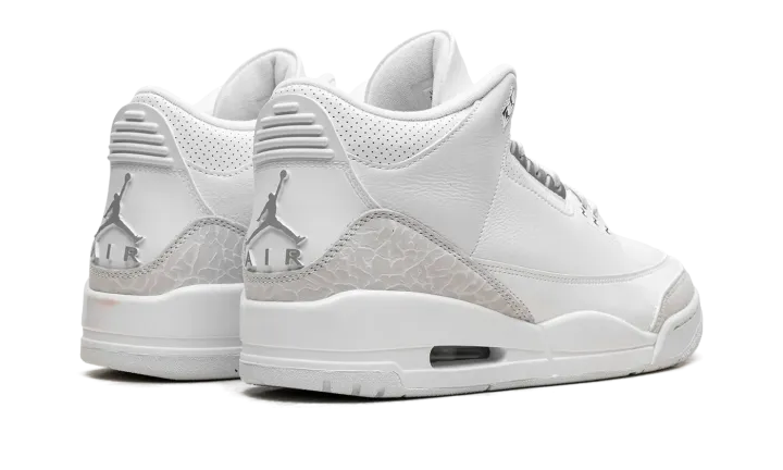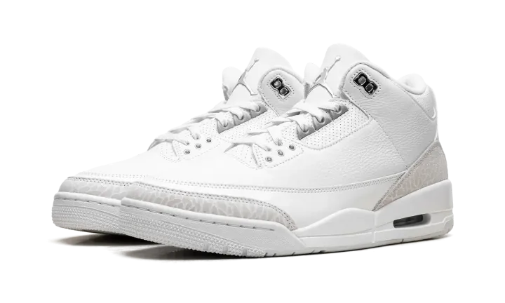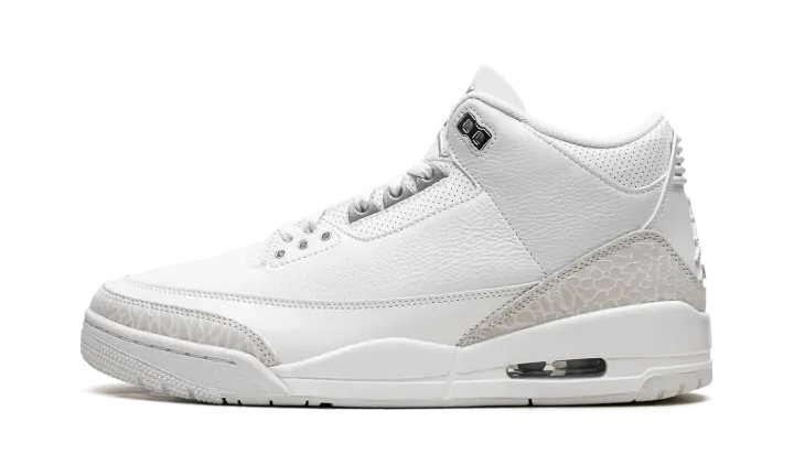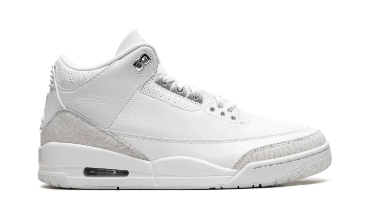 Elevate your look with the pristine style of the Air Jordan 3 "Pure Money." The all-white leather upper, complemented by subtle metallic silver accents on the eyelets and branding, offers a clean and luxurious aesthetic. The iconic elephant print adds a touch of texture, making this versatile sneaker a fresh statement piece.