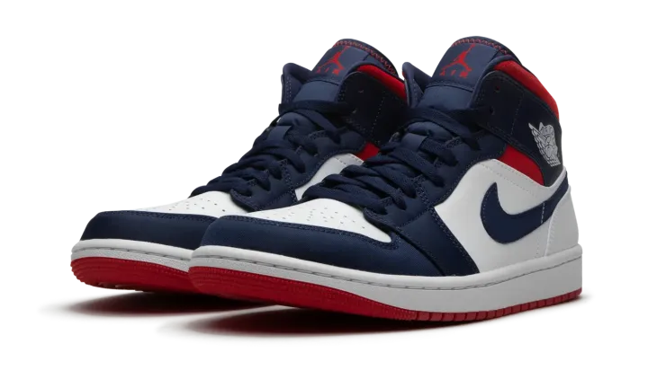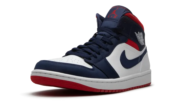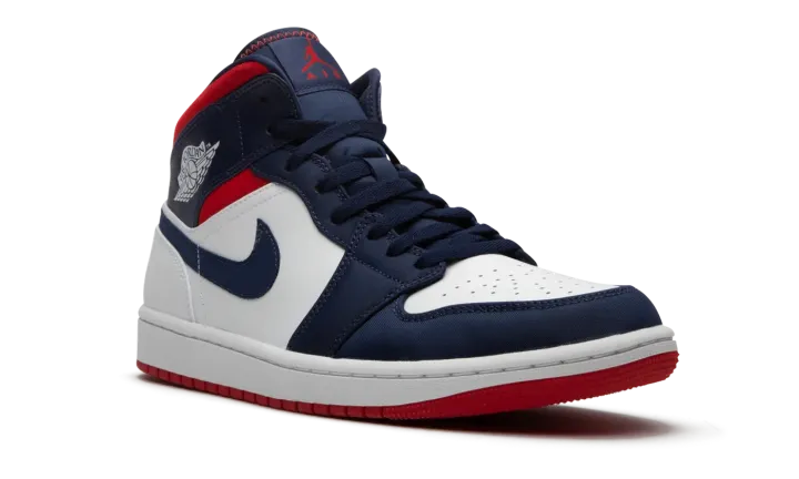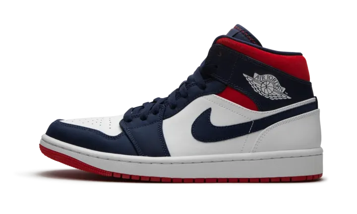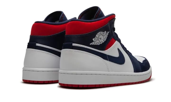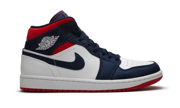 The Air Jordan 1 Mid "USA" is a special colorway of Michael Jordan's first signature shoe in mid-top form dedicated to Independence Day. The festive design features a color scheme of red, white, and blue for a decidedly patriotic look. Smooth white leather appears on the perforated toe, mid-panel, and heel. Contrasting navy blue nubuck overlays can be found on the forefoot, toe cap, eyelets, and collar. The hue reappears on the Swoosh detailing on the mid-panel. A white "Wings" logo dots the collar and red Jumpman branding covers the navy nylon tongue tag. Below, a white rubber midsole and contrasting red outsole finish off the "USA" Jordan 1 Mid.