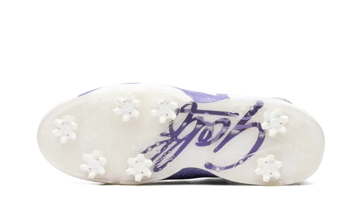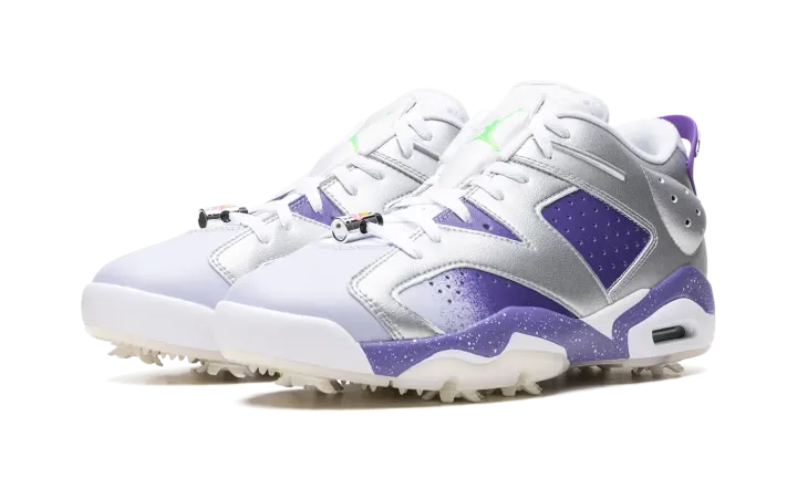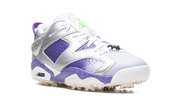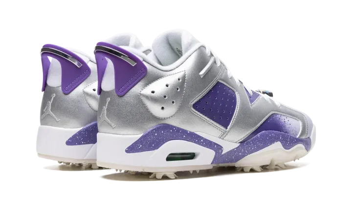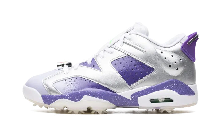 The Air Jordan 6 Low Golf "U.S. Open" is the alternate golf version of the sixth Air Jordan that celebrates the PGA Championship. The Jordan 6 Low Golf "U.S. Open" features a purple airbrush effect with Metallic Silver leather overlays throughout the design. A silver Jumpman is embroidered on the back of the shoe while a neon green Jumpman is embroidered on the tongue overlay. The mid-panel is painted purple with white speckle detailing. Underfoot, nubs on the outsole provide traction on a golf course. Release date: June 16, 2023