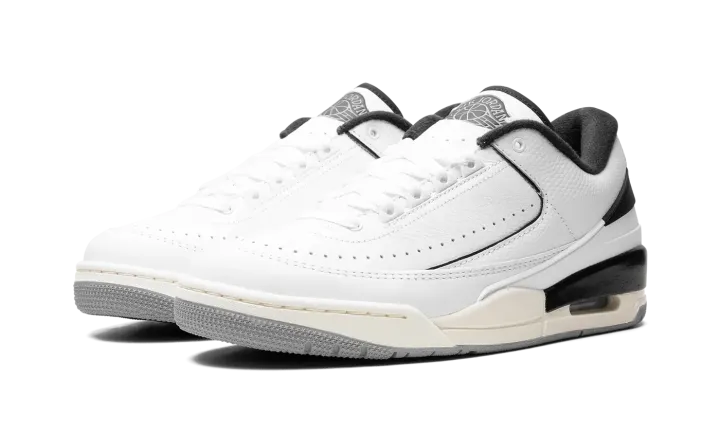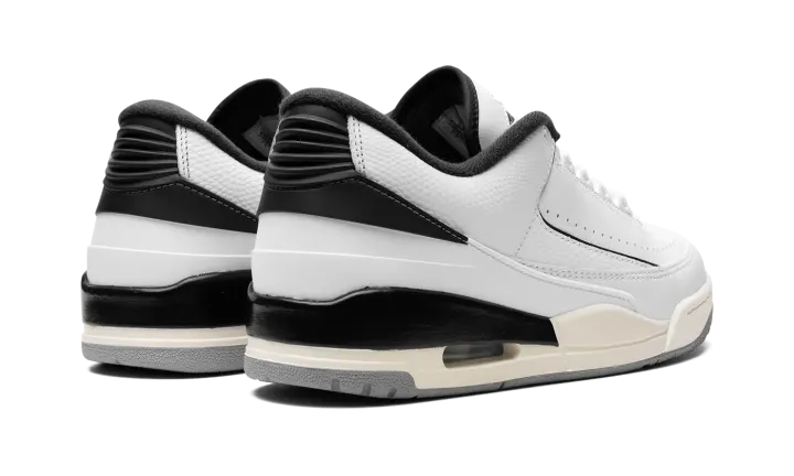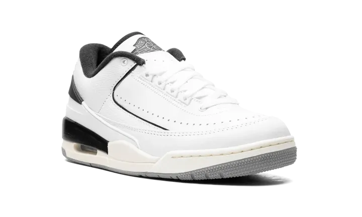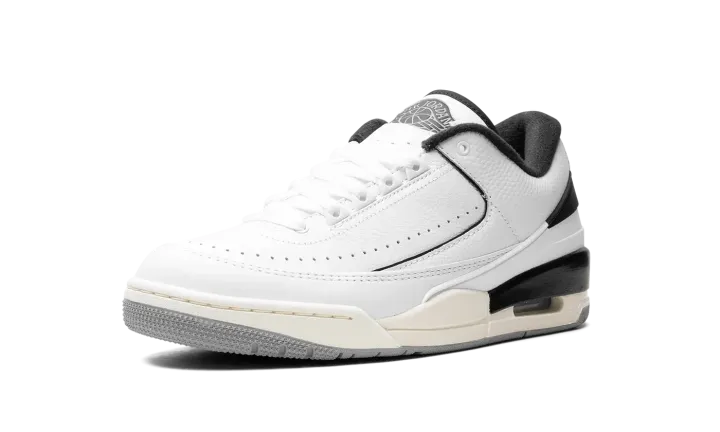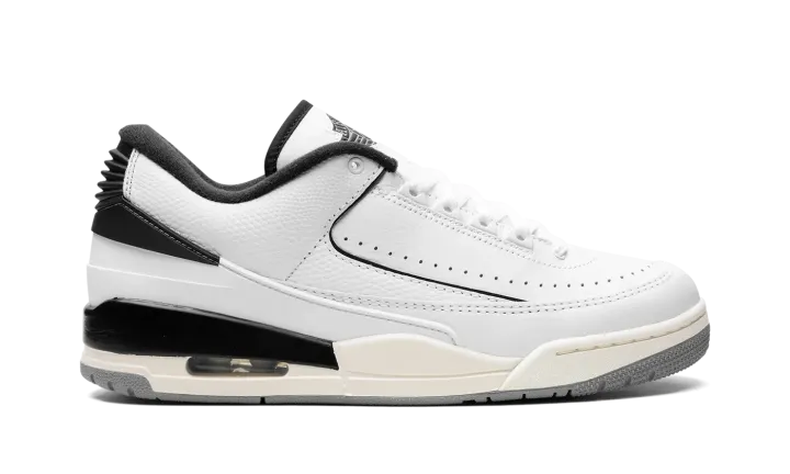 The Jordan 2/3 "White/Black" is a mostly two-toned, white-and-black colorway of the hybrid sneaker that blends elements of the Air Jordan 2 and Air Jordan 3. The Jordan 2/3 combines details from the Jordan 2 and Jordan 3, including the sole unit from the Jordan 3 and the upper construction of the Jordan 2 Low, among other features. On this colorway, the shoe is complete with a white leather construction with contrasting black accents on the heel counter, "Wings" logo on the tongue, and mudguard. Perforations wrap around the toe for ventilation. The midsole has a slightly aged look and features an Air unit in the heel.