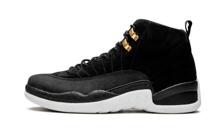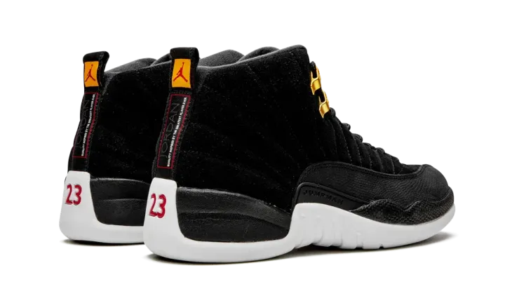 The Air Jordan 12 "Reverse Taxi" takes the classic "Taxi" colorway of the same shoe and flips it for a brand new look. Originally releasing in 1997, the Air Jordan 12 is one of the most recognizable Air Jordan models thanks to its continued run in the spotlight in present day sneaker culture. The "Reverse Taxi" design sports a black suede upper with luxurious gold accents on the eyelets, while the black nubuck mudguard features the original pebbled texture. Tonal Jumpman branding can be found on the mid-panel and the traditional "Two 3" branding on the tongue is done up in yellow embroidered lettering. A white rubber outsole features red Jumpman branding underneath the forefoot. The Air Jordan 12 "Reverse Taxi" was released on October 31, 2019.