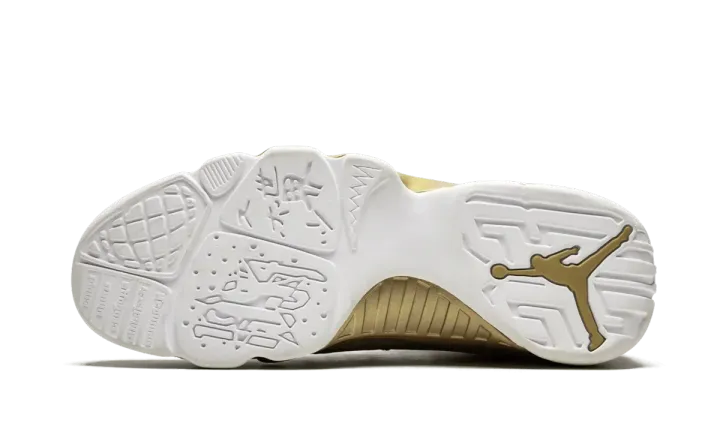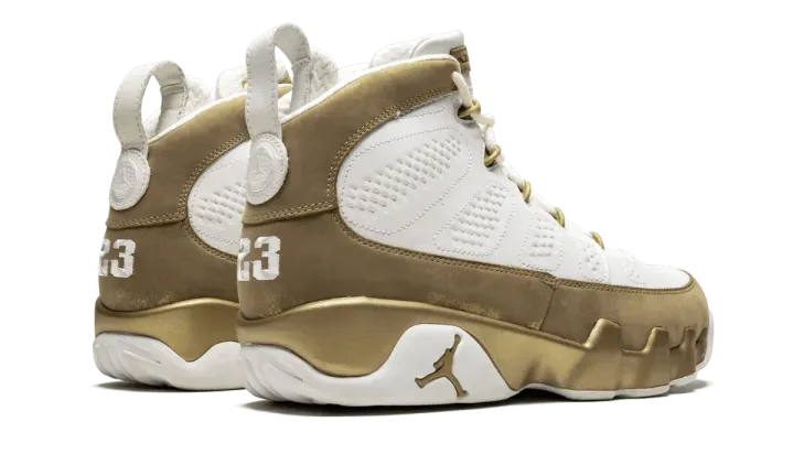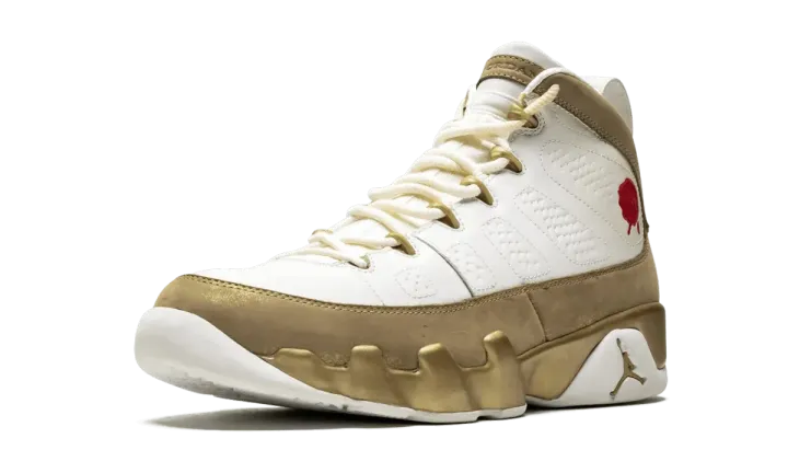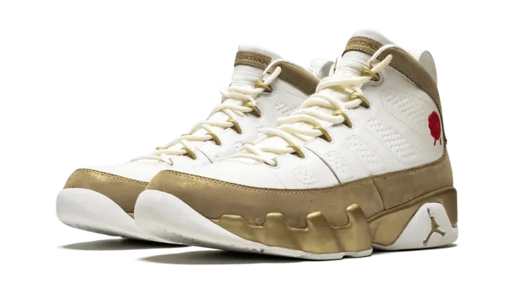 Perhaps the most premium edition of the Air Jordan 9 ever, the BIN23 release from the high quality and very limited Jordan collection features a soft white leather upper, with tan nubuck and gold accents. A special wax seal graphic is found on the upper of the left shoe.