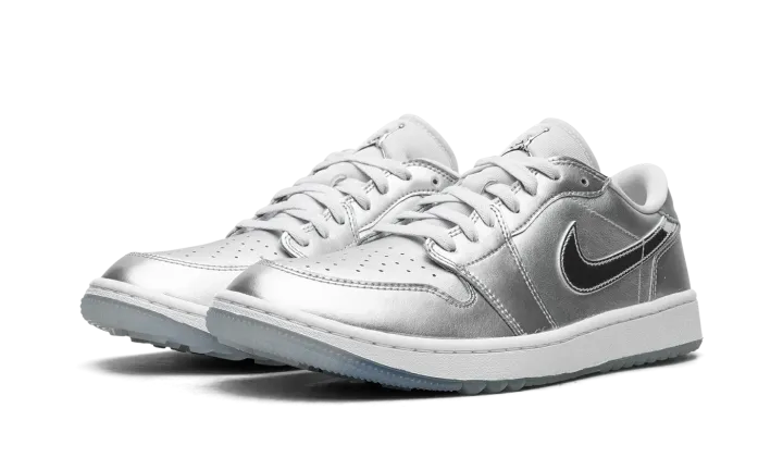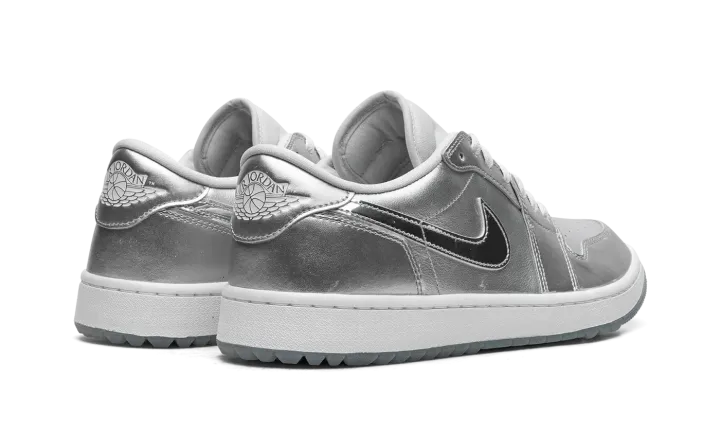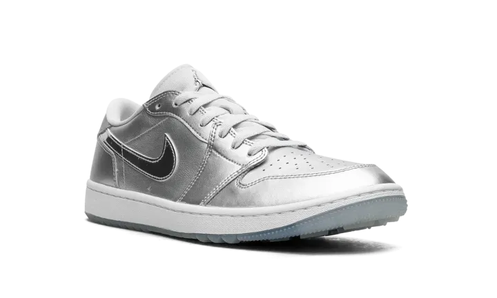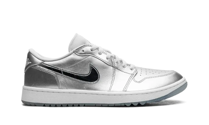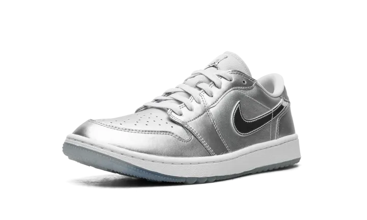 The Air Jordan 1 Low Golf "Gift Giving" is a colorway of the alternate version of the retro basketball shoe made for the golf course with an eye-catching, silver-based look. Loosely inspired by the Jordan 1's "Tokyo" colorway that surfaced as part of Nike's former "Concept Japan" or "Co.Jp" collection from the early 2000s, the "Gift Giving" features Metallic Silver accents throughout its design, with the flashy silver hue appearing on the base and overlays. A white leather Swoosh can be found on either side of the shoe. A "Wings" logo appears on the heel and a Metallic Silver Jumpman emblem is found on the tongue. Underfoot, a white rubber midsole and icy blue translucent outsole with small nubs completes the look. Release date: November 17, 2023