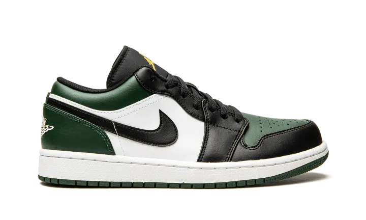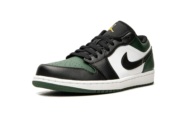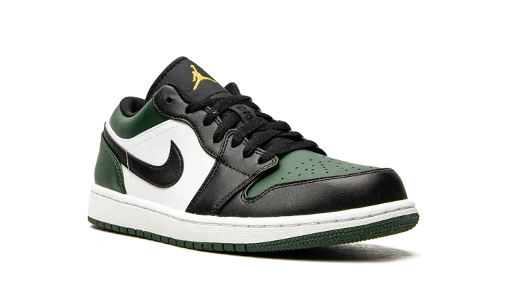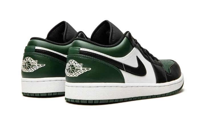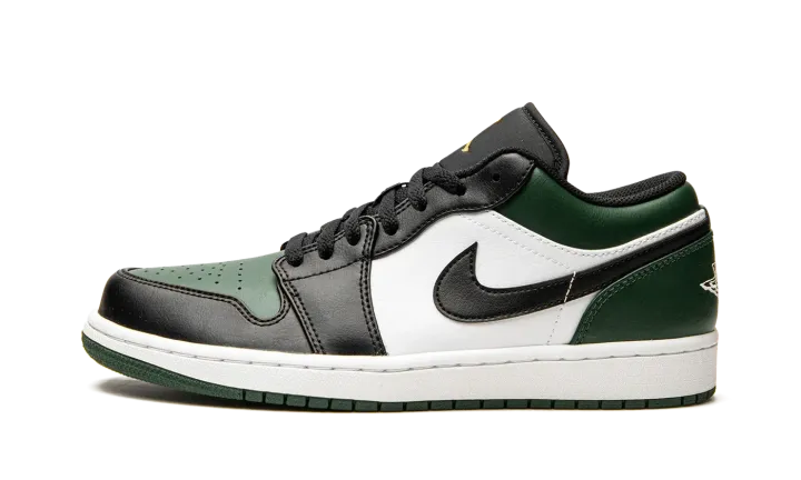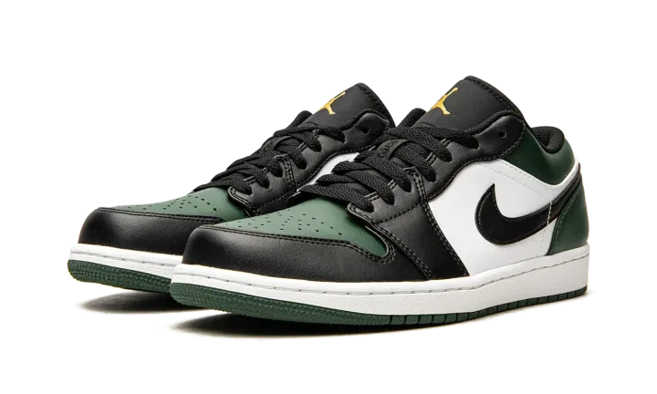 The Air Jordan 1 Low "Green Toe" is a timeless look for the vintage basketball shoe that mirrors the color block of the model's original "Black Toe" colorway from 1985. The "Green Toe" version of Michael Jordan's first signature shoe in its low-top silhouette has a Noble Green-colored perforated toe that is contrasted with black leather on the forefoot and eyelets. The look mimics the appearance of the Air Jordan 1 "Bred Toe." The mid-panel is constructed in white leather and the collar and heel appear in Noble Green leather. A black Swoosh resides on either side of the shoe. A white "Wings" logo is embroidered onto the heel and a gold Jumpman is found on the black nylon tongue. Tonal "23" branding is located on the black lace overlay on top of the black laces. A two-tone, white midsole and Noble Green-colored rubber outsole finish off the design. Release date: October 12, 2021