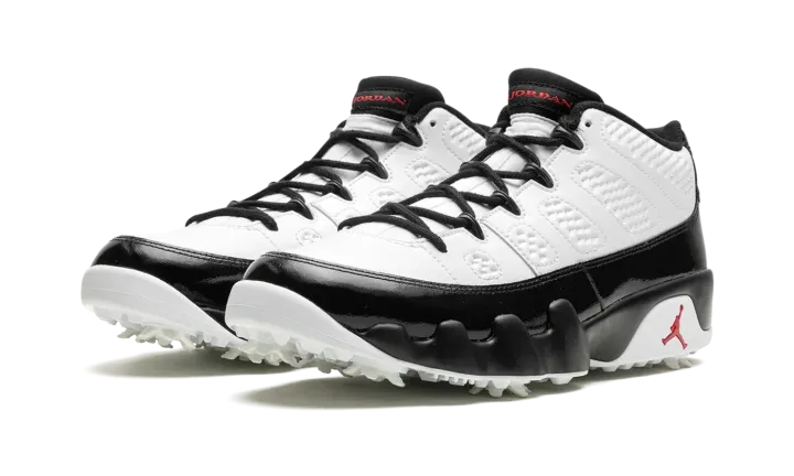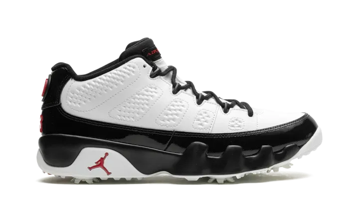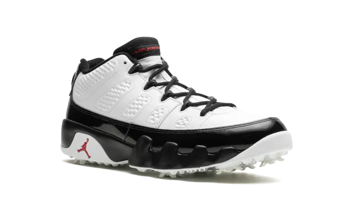 The Air Jordan 9 Golf "True Red" is the golf version of Michael Jordan's ninth signature shoe in one of the model's original colorways. The "True Red" debuted on the Jordan 9 in the mid-90s and, here, it appears on the modified version of the retro basketball shoe made for the fairway. The upper features a white leather base with glossy black leather accents. A Team Red "Air Jordan" logo appears on the tongue tag, while a red globe emblem can be seen on the heel above red "23" embroidery. Underneath the shoe, a cleated outsole provides superior traction on the golf course. Release date: February 23, 2024