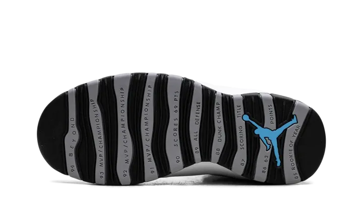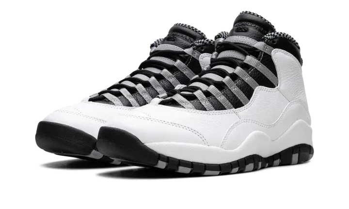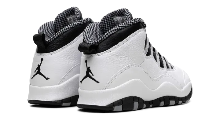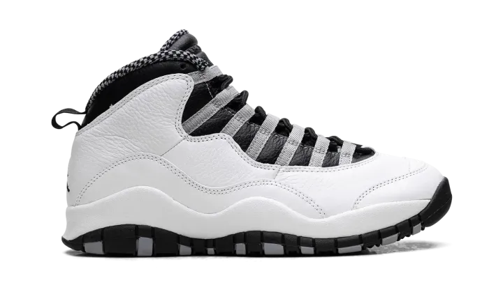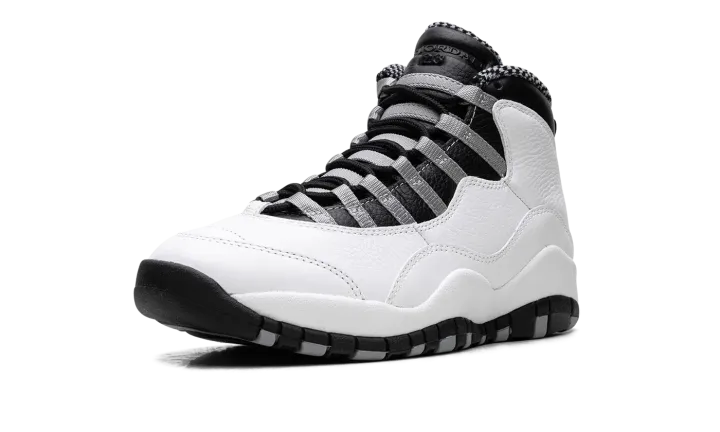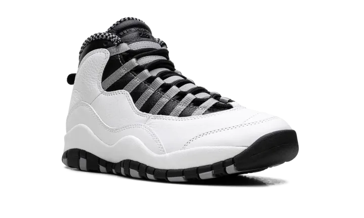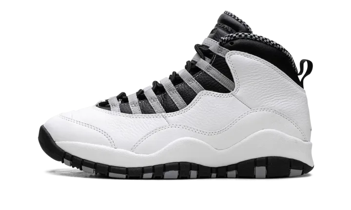 Elevate your sneaker game with the Air Jordan 10 "Steel." This iconic shoe offers a blend of heritage design and clean appeal, highlighted by its sharp grey and black details against a white base. It's a stylish and comfortable choice for any fan who appreciates classic Jordan aesthetics.