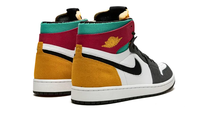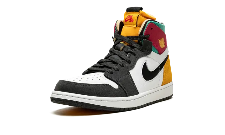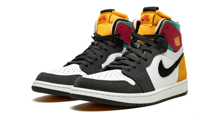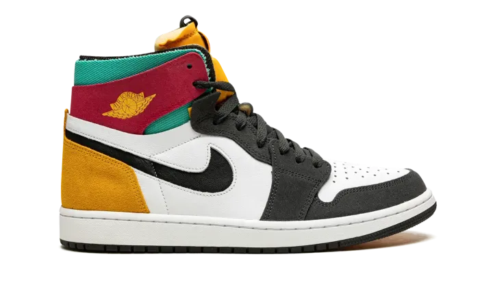 The Air Jordan 1 High Zoom CMFT "Multicolor" is the modern version of the retro basketball shoe in a vibrant colorway with mismatching panels. The Jordan 1 Zoom Comfort is an alternate edition of the popular, old school basketball shoe once worn by Michael Jordan. It features upgraded Zoom Air technology embedded in its midsole, and exposed foam padding on the tongue and mesh on the collar to differentiate the model from standard Jordan 1s. On the "Multicolor," both the perforated toe and mid-panel are designed in white leather. The forefoot and eyelets are constructed in black suede while the heel is designed in University Gold suede. A black leather Swoosh appears on either side. A gold "Wings" logo is found on the maroon collar overlay. Two foam padded panels appear on the collar: one in black, one in Washed Teal. Release date: May 10, 2022
