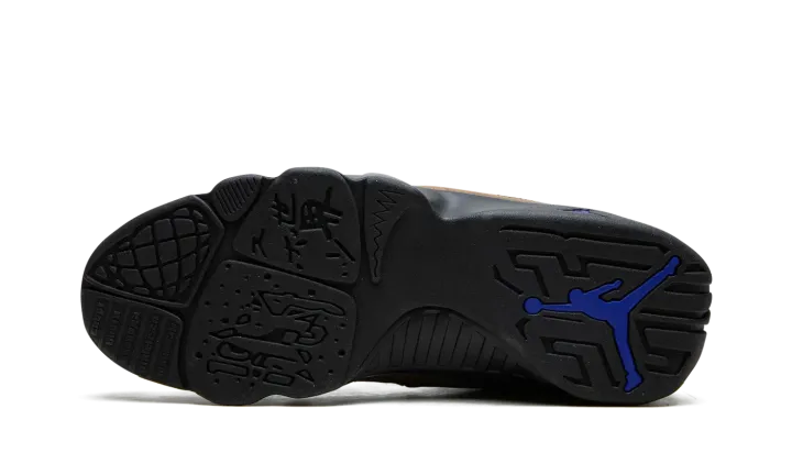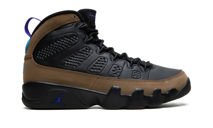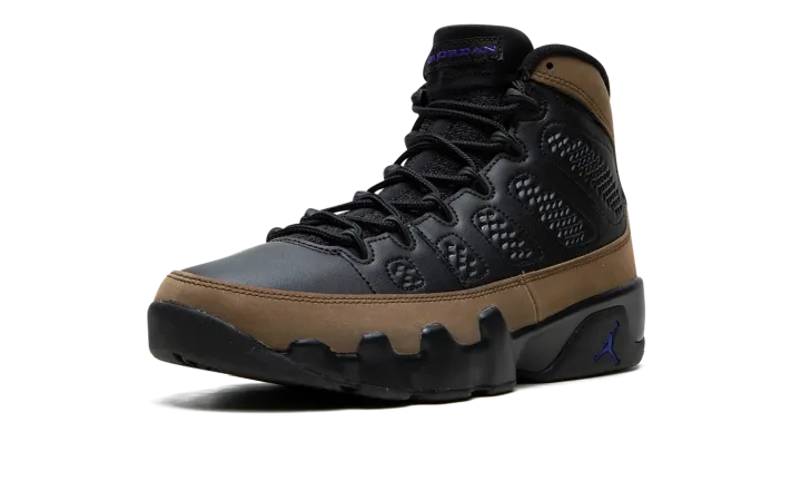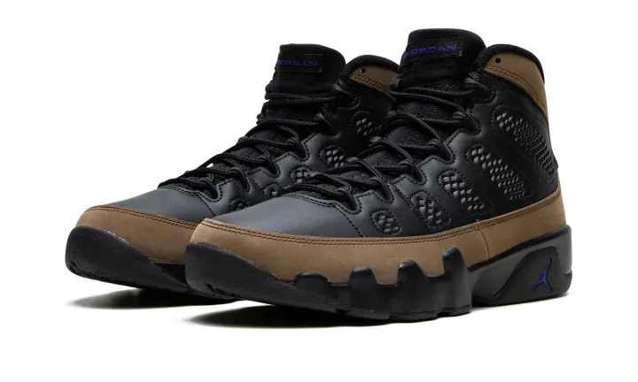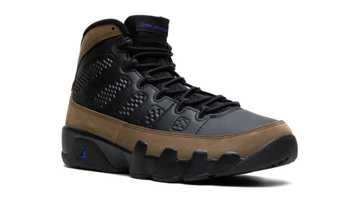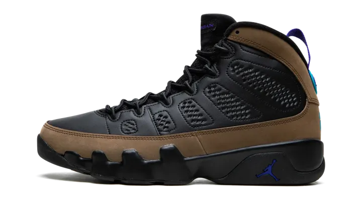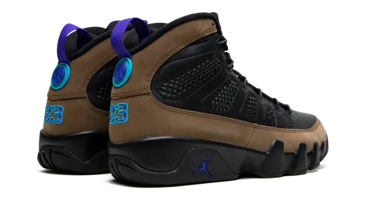 The Air Jordan 9 "Olive Concord" is a colorway of the retro basketball shoe that draws favorably from its original "Olive" style, but with a twist. Based on the Jordan 9 "Olive" colorway that was released in 1994, the "Olive Concord" updates the design with subtle Concord-colored accenting on various points of the shoe. The upper features a black leather construction with a contrasting Olive mudguard. Concord detailing comes into play on the Jumpman on the side of the black midsole and on the "globe" branding on the heel. Additional Concord hits appear on the "Jordan" logo on the tongue and on the outline of the turquoise "23" branding on the heel. Release date: January 7, 2023