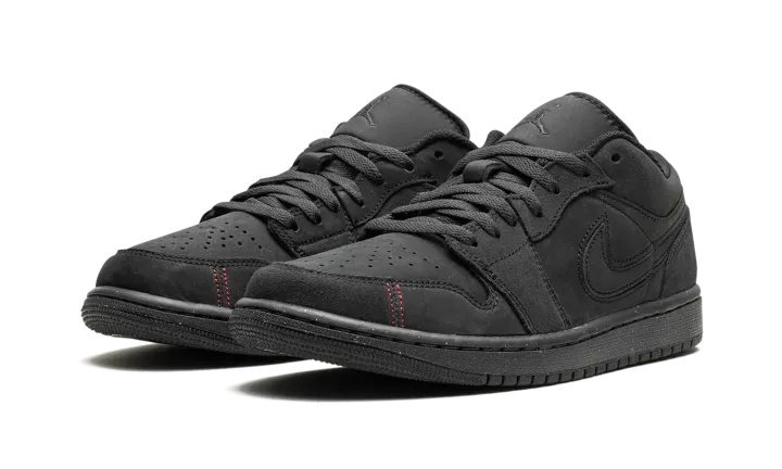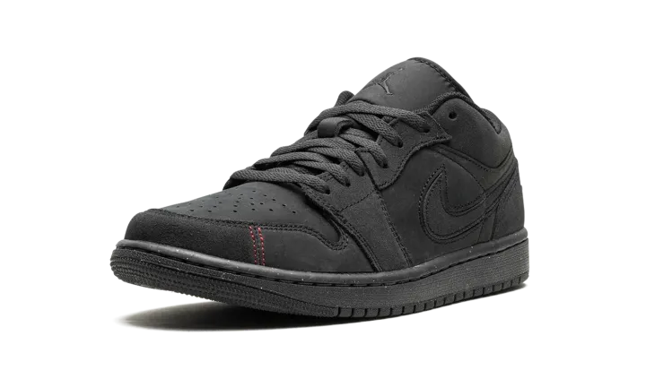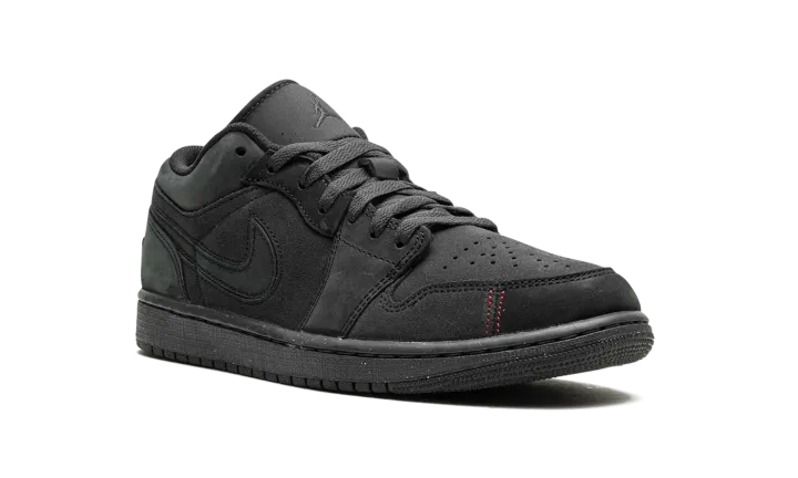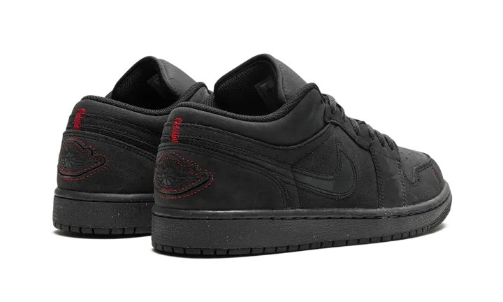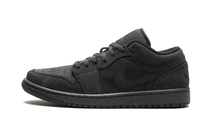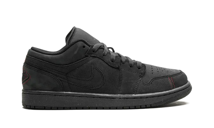 The Air Jordan 1 Low SE Craft "Dark Smoke Grey/Varsity Red" is a stealthy colorway of the alternate version of the retro basketball shoe. The Jordan 1 Low SE Craft modifies the Jordan 1 Low with premium materials, and different panel shapes and stitching patterns. The colorway features a Dark Smoke Grey nubuck and suede construction. Red contrast stitching appears on the toe and heel, breaking up the shoe's monochromatic dark grey appearance. Release date: December 31, 2023