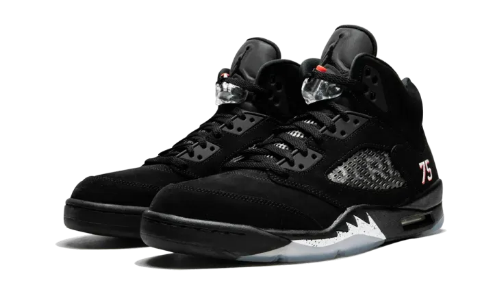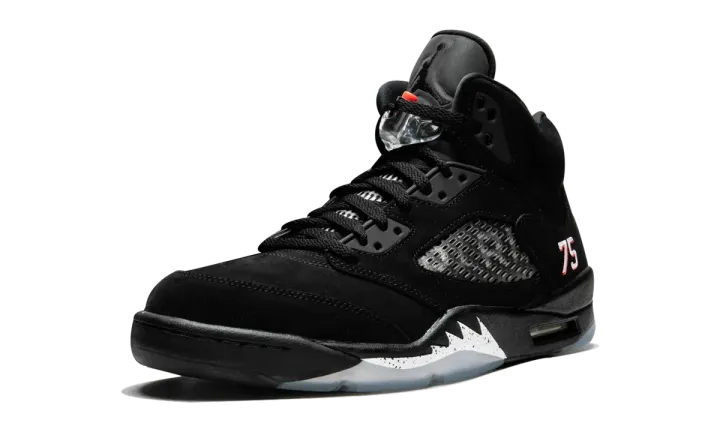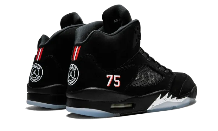 The PSG x Air Jordan 5 was part of an exciting new collaboration from Jordan Brand and the French professional soccer club Paris Saint-Germain that launched in the fall of 2018. This was the first time that Jordan Brand had created a collection with a soccer team, and the limited edition Air Jordan 5 was the highlight of the partnership. The classic silhouette is crafted from black nubuck with white and red details. The color scheme is inspired by the club's uniforms. PSG branding is found throughout the shoe, with co-branded logos on the heels and outsoles. "PARIS" is spelled out using the Jumpman for the "A" behind the clear plastic mesh panels on the midfoot. The number "75" is stitched on each heel in place of the traditional "23" as a nod to the first two numbers of Paris' zip codes. The final touch is the addition of the team slogan "Ici C'est" on the inside of each tongue.