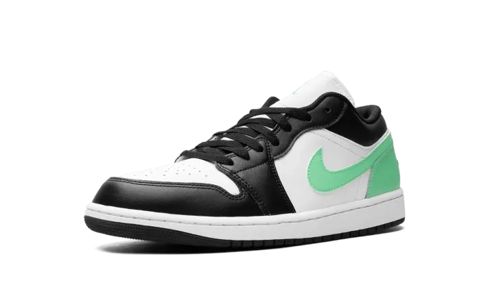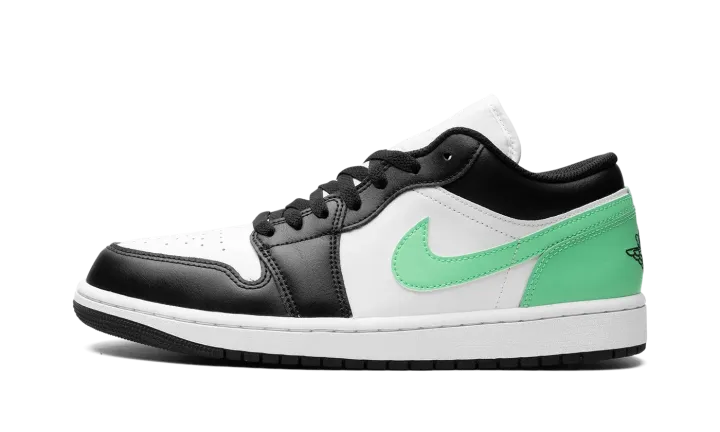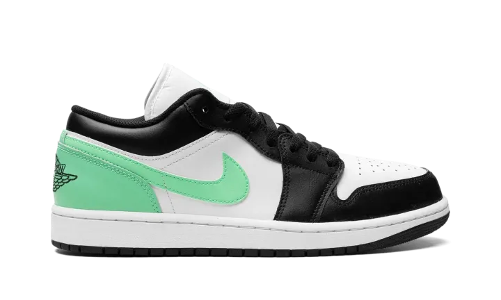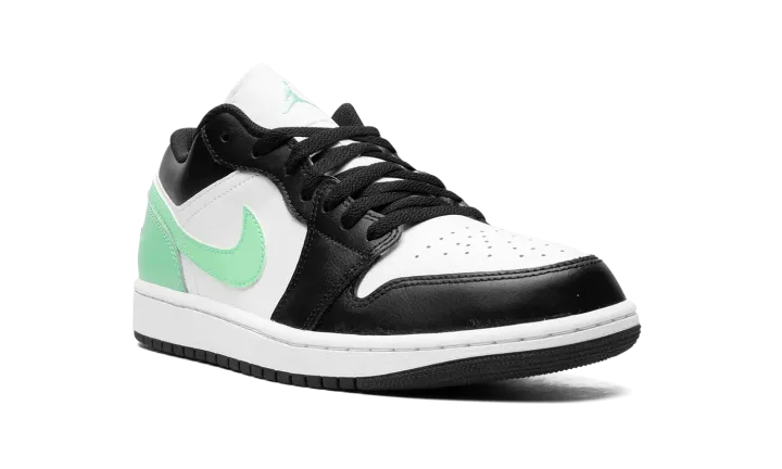 The Air Jordan 1 Low "Green Glow" is a colorway of Michael Jordan's first signature shoe in the low-top style with eye-catching green features. The colorway is complete with a white leather upper with a black leather toe cap, forefoot, and eyelets. A Green Glow leather Swoosh appears on the sides and Green Glow leather on the heel. More Green Glow accenting can be found on the Jumpman on the tongue. Underfoot, a white rubber midsole and black rubber outsole complete the look. Release date: March 20, 2024