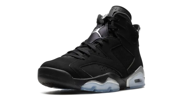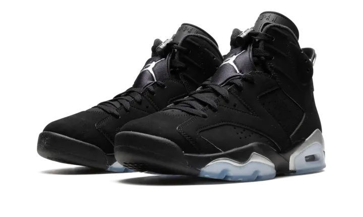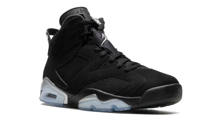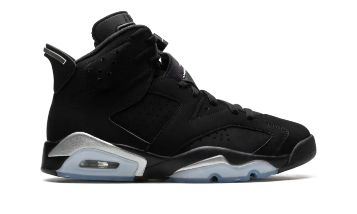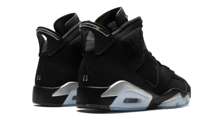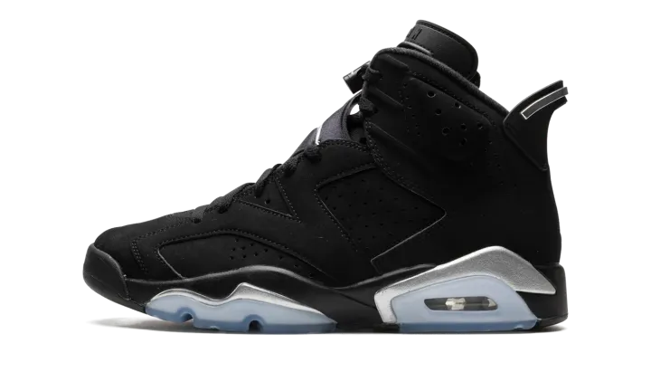 The Air Jordan 6 "Chrome 2022" is the modern reissue of the popular non-original colorway of the retro basketball shoe in mid-top form. Originally released back in 2002 on the Jordan 6 Low, the "Chrome" was brought back on the model's original mid-top silhouette in November 2022. The modern "Chrome" color block is identical to the original version from back in the day. The shoe features a black synthetic nubuck upper with contrasting Metallic Silver or "Chrome" accents on the mudguard above the visible Air cushioning unit in the heel and on the forefoot. Additional chrome-colored detailing includes a Metallic Silver Jumpman on the tongue, and "23" branding beneath the black embroidered Jumpman on the heel. A small silver Jumpman appears on the lace toggle. Release date: November 12, 2022