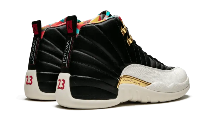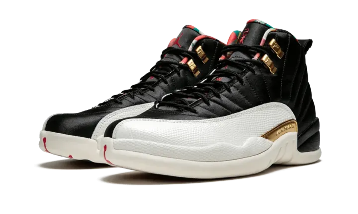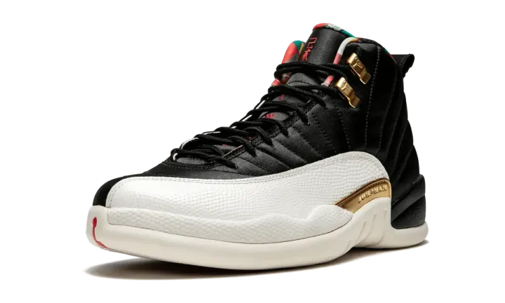 The Air Jordan 12 "Chinese New Year" is 2019's contribution to the annual tradition of special edition Air Jordan releases to celebrate the Chinese New Year. For the 2019 collection, Nike opted to combine all 12 Zodiac signs into one unified pattern inspired by traditional Chinese patchwork called Bai Jia Yi. A definite highlight of the entire 2019 Nike Chinese New Year collection, the Air Jordan 12 receives a Black Satin upper with a contrasting Sail shade for the pebbled leather toe panels and outsole for a classic AJ12 color block. Metallic gold accents complete the exterior, while a colorful patchwork print is found on the inner lining. The limited edition Air Jordan 12 "Chinese New Year" released on February 5, 2019.