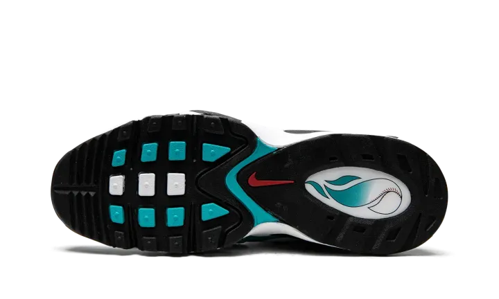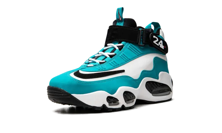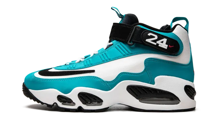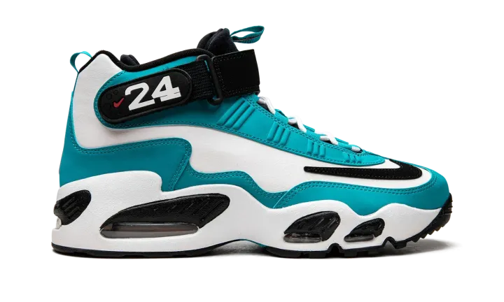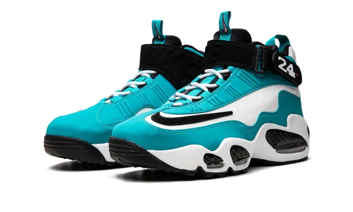The Nike Air Griffey Max "Aqua" is a colorway of Ken Griffey Jr.'s former signature shoe that is loosely inspired by the Baseball Hall of Famer's time with the Seattle Mariners. The "Aqua" or "Aquamarine" was released in May 2022, and is one of several colorways of the retro performance shoe to be released after its 25-year anniversary, which occurred in 2021. A black Swoosh logo appears on the forefoot of the white leather upper. Aqua-colored synthetic nubuck is found along the eyelets and on the mudguard. Griffey's "24" jersey number with the Mariners appears on the side of the black adjustable ankle strap. Release date: May 12, 2022