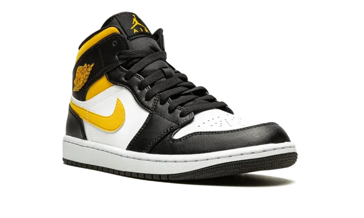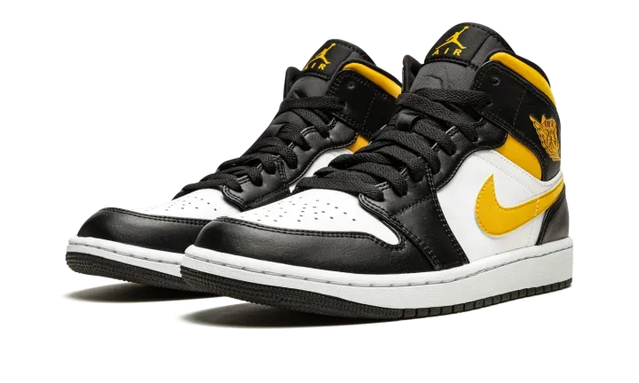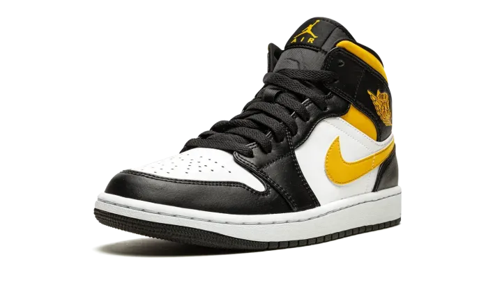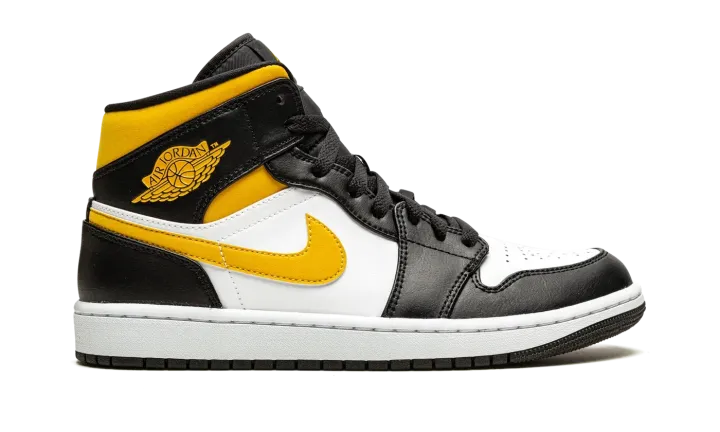 The Air Jordan 1 Mid "White/Pollen/Black" is a clean look for the mid-top version of the retro basketball shoe. In "White/Pollen/Black," the Jordan 1 Mid arrived in 2021 in yet another wearable colorway. The perforated toe and mid-panel display a white leather construction. Contrasting black leather can be found on the various overlays on the upper, including on the Swoosh logo. A University Gold "Wings" logo appears on the black leather overlay on the yellow leather collar. Additional University Gold accenting comes into play on the Jumpman and "Air" branding on the tongue tag.