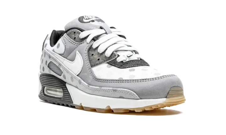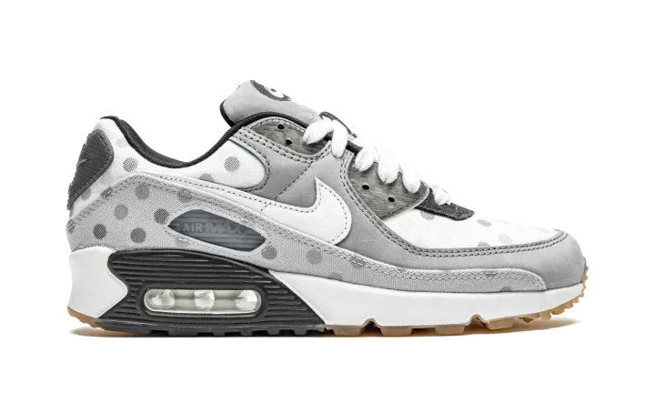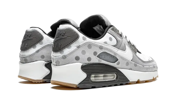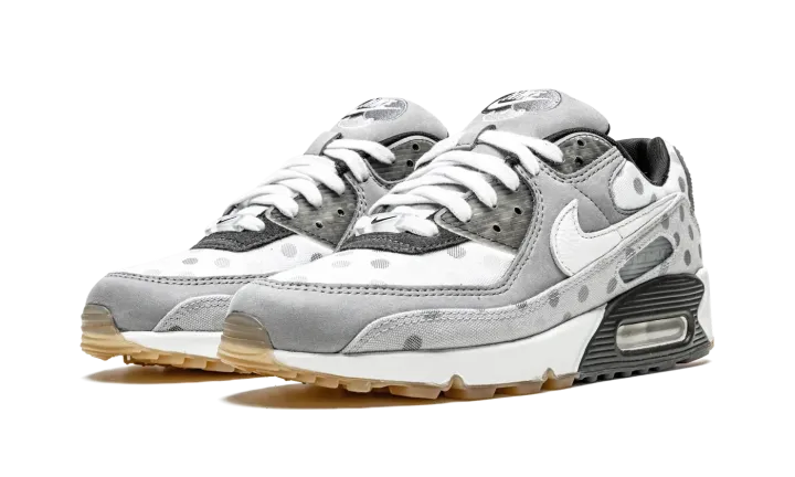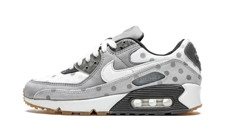 Summit white/white/grey fog leather Air Max 90 sneakers from NIKE featuring polka dot print, panelled design, signature Swoosh logo detail, logo-embroidered tongue, round toe, front lace-up fastening, rubber sole and waffle sole. These styles are supplied by a premium sneaker marketplace. Stocking only the most sought-after footwear, they source and curate some of the most hard to find sneakers from around the world..