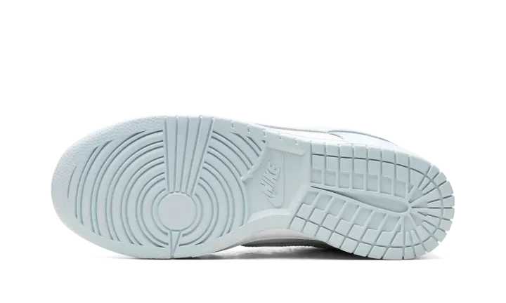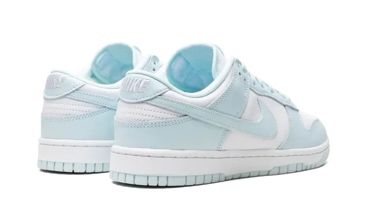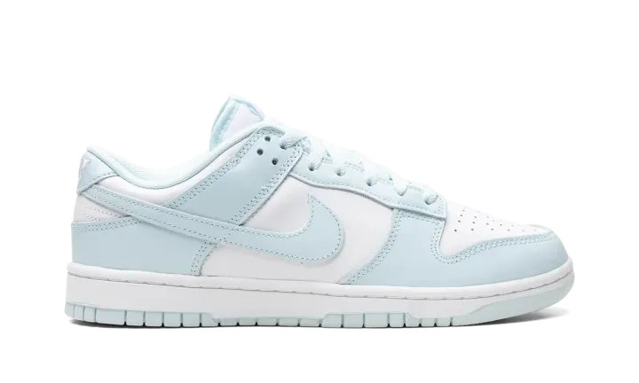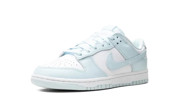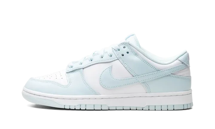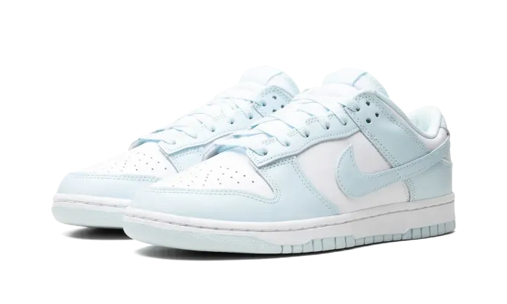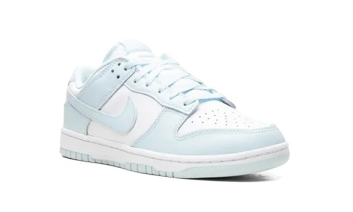 The Nike Dunk Low "Glacier Blue" is a colorway of the retro basketball shoe with light blue features. The upper features a white leather base with Glacier Blue leather overlays and Swoosh branding. A white "Nike" logo is embroidered on the heel, while "Nike" and Swoosh logos are printed on the tongue tag. Finishing details include a white rubber midsole and a Glacier Blue rubber outsole. Release date: May 16, 2024