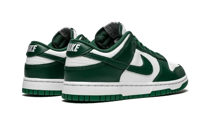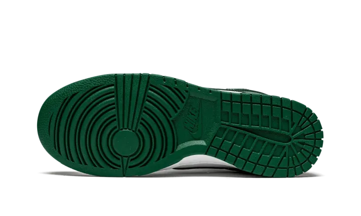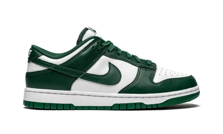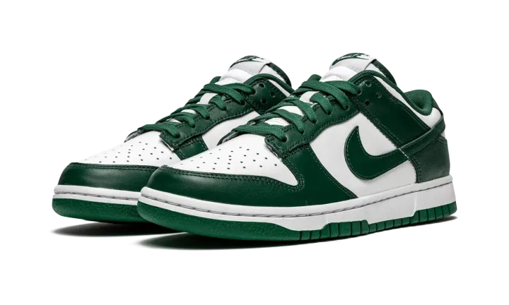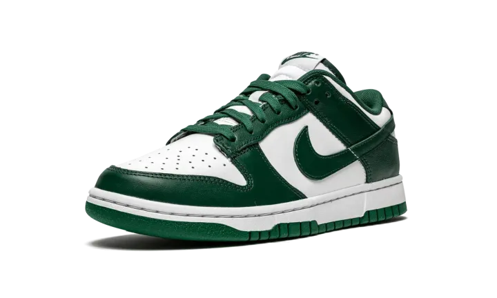 The Nike Dunk Low "Team Green" is based on team uniform colors of the Michigan State Spartans college basketball team. The "Team Green" is inspired by Nike's original "Be True to Your School" pack that was dedicated to some of the top college basketball programs in the country during the mid-to-late 1980s. In 2020, Nike released the "Spartan Green" Dunk High, which is basically a high-top version of the "Team Green" seen here. Like the aforementioned design, the "Team Green" features a white leather base with contrasting Team Green leather overlaid panels. A green leather Swoosh appears on either side and white "Nike" detailing is embroidered on the heel. Green laces are layered over the white nylon tongue. A white midsole and green outsole finish off the look of the Nike Dunk Low based on the color block of the Michigan State Spartans' team uniforms. Release date: April 16, 2021.