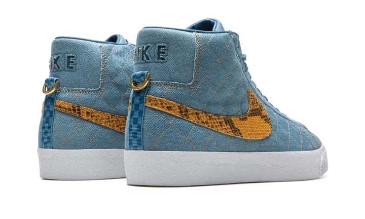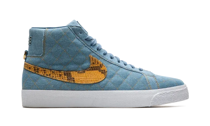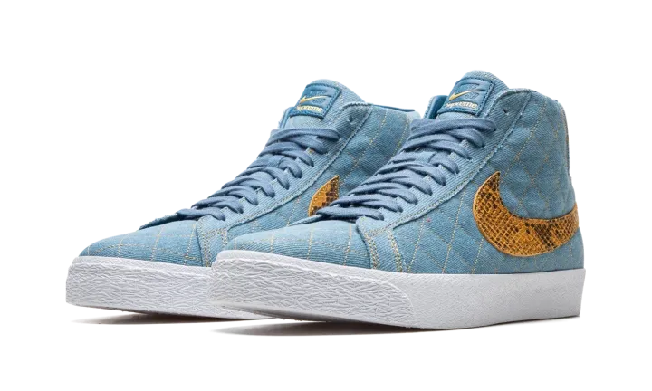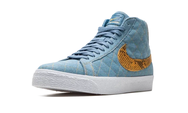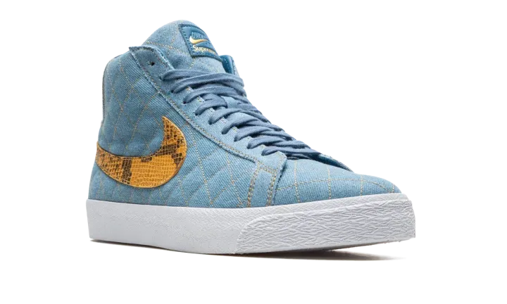 The Supreme x Nike SB Blazer Mid "Denim" is one of two colorways of the retro skate shoe co-designed by the "World Famous" streetwear brand and Nike in 2022. The Supreme x Nike SB Blazer collection from 2022 succeeds the duo's original SB Blazer collaboration from 2006, considered one of the most desirable Supreme x Nike team ups in sneaker history. Like the original collaboration, the modern Supreme SB Blazer Mid features a luxury-inspired design highlighted by a gold D-ring on the checkerboard heel panel. The upper is constructed from a quilted denim material with contrast yellow stitching throughout. An orange faux snakeskin Swoosh can be found on both sides of the shoe. A "NIKE" logo is found on the heel, and dual Supreme and Nike SB detailing appears on the tongue. Underfoot, a white vulcanized rubber sole completes the design. Release date: September 8, 2022
