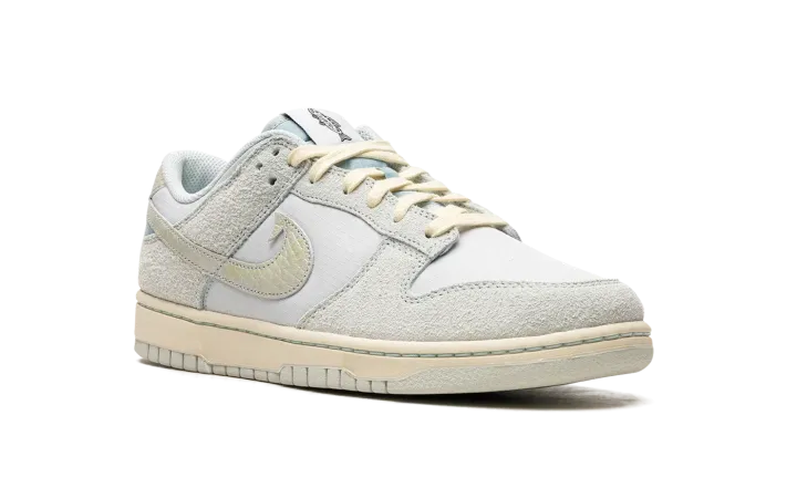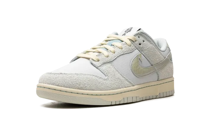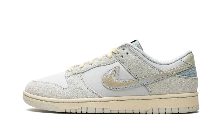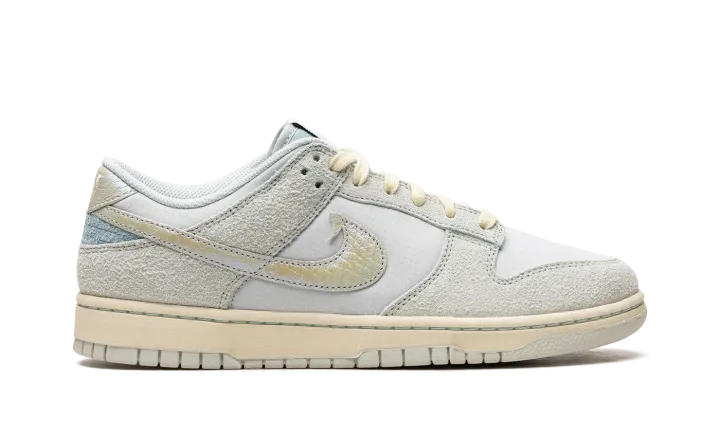 The Nike Dunk Low "Gone Fishing" is a colorway of the retro basketball and casual shoe with a fish-inspired appearance. Also known as the "Chinook Salmon" colorway, this Dunk Low features an eye-catching design with iridescent scaled Swooshes, including a "tooth" appearing at the top of the Swoosh on the lateral side. As for the rest of the shoe, the base is made from a Photon Dust ballistic nylon base. Tonal suede overlays add another visual appeal to the sneaker. Fish detailing is printed on the tongue tag and insole. The cream rubber midsole and matching laces give the design a vintage look. Release date: June 16, 2023