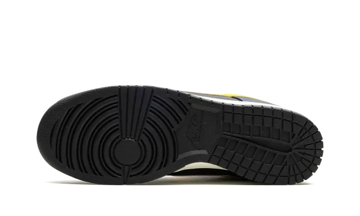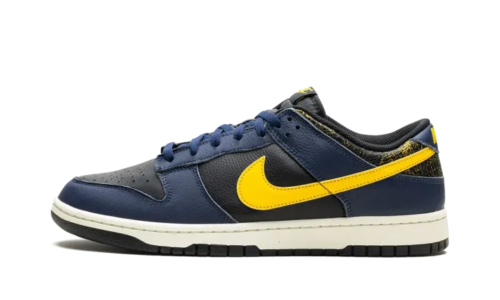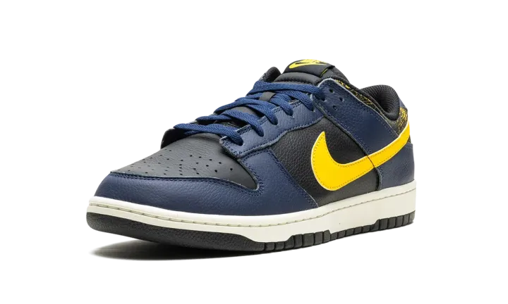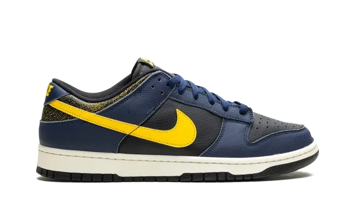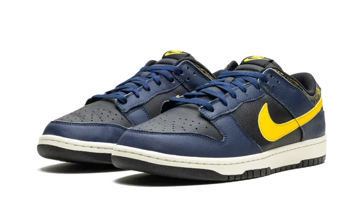 The Nike Dunk Low Vintage "Michigan" is a colorway of the classic basketball shoe with an aged aesthetic loosely inspired by the Michigan Wolverines college basketball team. The Nike Dunk was released in a "Michigan" colorway in 1985 and, here, the shoe informs the colors and design of the Dunk Low Vintage "Michigan." Specifically, the upper has a black leather base and Midnight Navy leather overlays. A Varsity Maize leather Swoosh appears on the sides, while a yellow "Nike" logo is embroidered on the heel. The collar is designed with an aged, cracking aesthetic that suggests the look of prolonged wear. Underfoot, a Sail rubber midsole completes the look. Release date: February 1, 2024