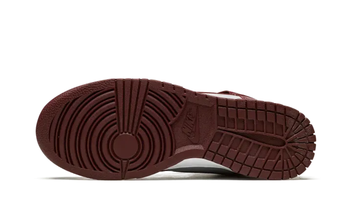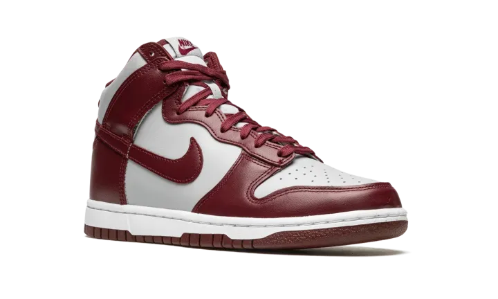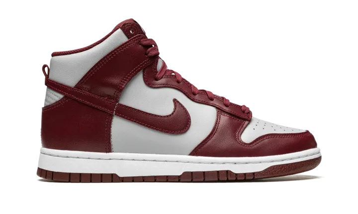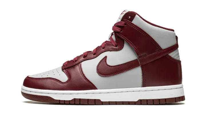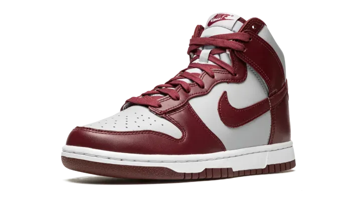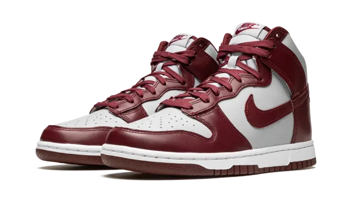 The Nike Dunk High "Dark Beetroot" is a two-tone, grey and burgundy colorway of the retro basketball shoe. The "Dark Beetroot" adheres to the classic two-tone color block employed by the original Dunks from 1985's "Be True to Your School" collection of college basketball-inspired colorways, giving the shoe a vintage look. Grey leather appears on the base of the shoe while Dark Beetroot-colored leather is found on the overlay panels and on the Swoosh branding on both sides. Additional burgundy detailing comes into play on the "Nike" and Swoosh logo found on the tongue tag, and on the laces. A white rubber midsole and Dark Beetroot-colored outsole finish off the look.