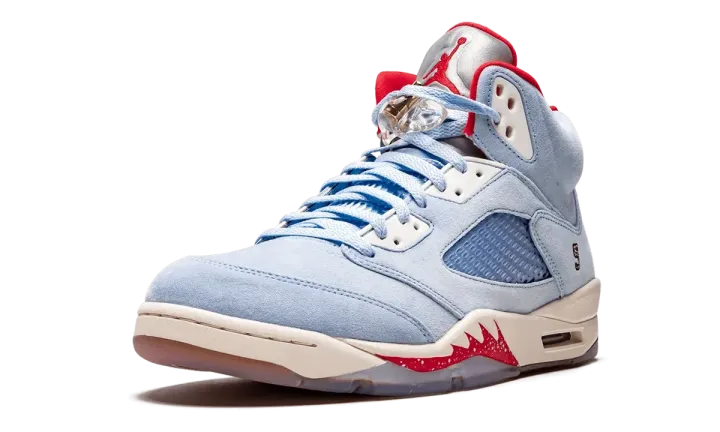 The Trophy Room x Air Jordan 5 "Ice Blue" is a limited edition colorway of the iconic silhouette by the boutique owned by Michael Jordan's son, Marcus. The unique colorway is inspired by Michael Jordan's trophy room, which was an important part of the Jordan family house that Marcus grew up in. The Jordan 5 features an Ice Blue suede upper with red and Sail accents across the upper and midsole. Hits of metallic gold appear on the lace lock and on the "5" and "23" numerals embroidered on each heel. A traditional reflective silver tongue and Trophy Room and Jumpman logos on opposite heels complete the upper. The full-length clear rubber outsole reveals a wood floor graphic beneath it, a reference to the basketball court-style floor of Jordan's trophy room. For one final special detail, each pair also features cork insoles. The Trophy Room x Air Jordan 5 "Ice Blue" was limited to only 7,000 individually-numbered pairs, and released on May 18, 2019.