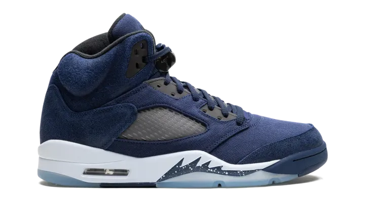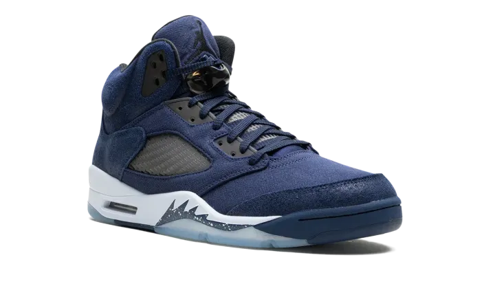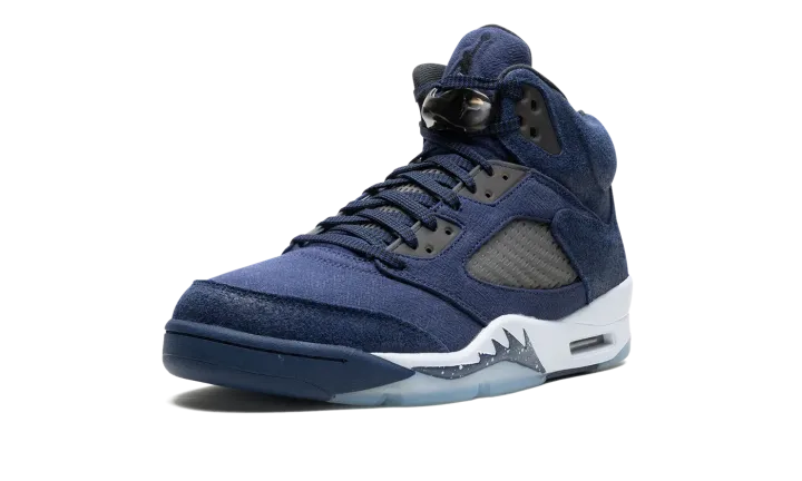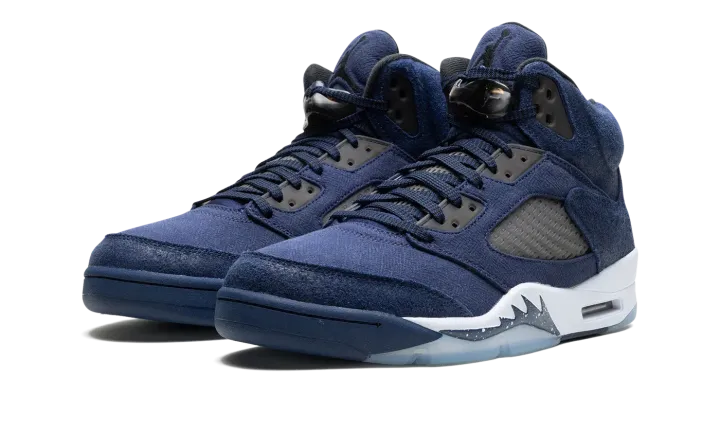 The Air Jordan 5 "Midnight Navy" is a colorway of the retro basketball shoe loosely inspired by the Georgetown Hoyas college basketball team. While not affiliated with the Hoyas, the "Midnight Navy" updates Michael Jordan's fifth signature shoe with a dark navy blue textile upper with suede on the heel, collar, and toe panels. Smoky translucent netting appears on the side and tongue. A black Jumpman is embroidered on the heel and textile tongue. Navy shark tooth detailing with white speckling on the light grey midsole sits above the solid navy and translucent outsole. Release date: November 10, 2023