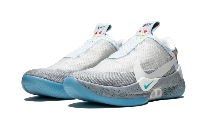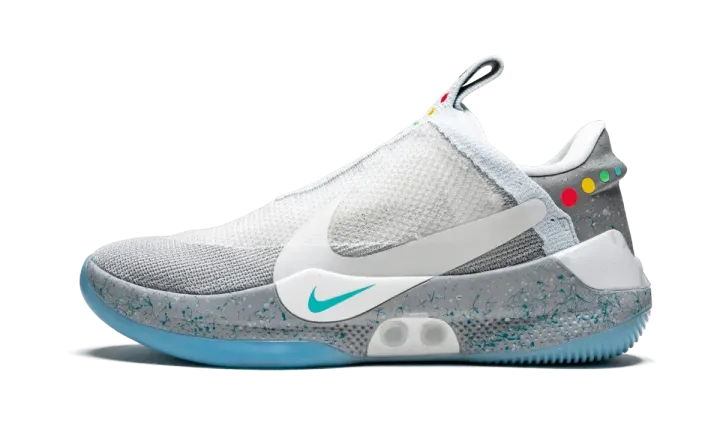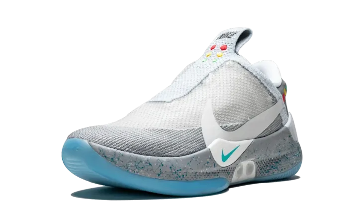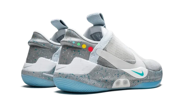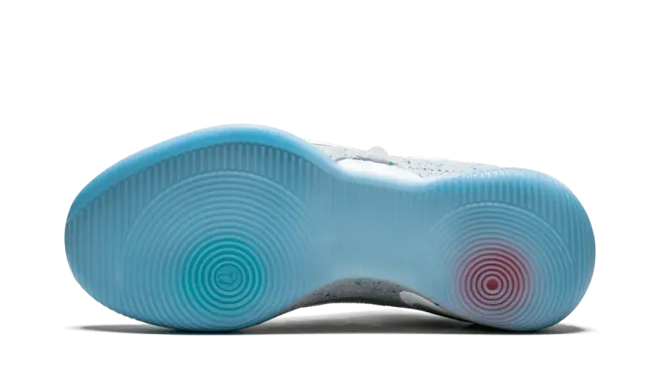 The Nike Adapt BB "Mag" is a special edition of the power-lacing Nike Basketball shoe inspired by the legendary Nike Mag. Nike's first power-lacing shoe for basketball appropriately receives this colorway taken from the once fictional, now real sneaker from "Back to the Future Part 2." The upper features a grey shade for the overlaying shroud with blue speckles across the heel and midsole. Multicolor circle details are added as a reference to the lights on the Mag, and an icy clear rubber outsole completes the perfect execution. The limited edition Nike Adapt BB "Mag" released on May 29, 2019.