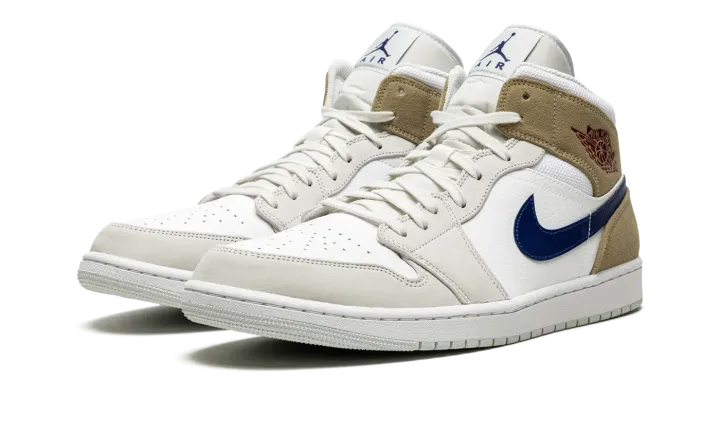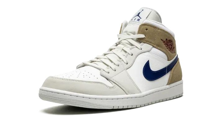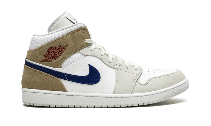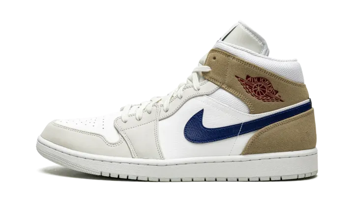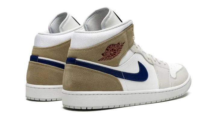 The Air Jordan 1 Mid "Tan Suede" is a colorway of the popular mid-top lifestyle shoe that can be worn with ease in all four seasons. An essential component of any great sneaker collection, the Jordan 1 Mid is both comfortable and timeless in design. On the "Tan Suede," the shoe's upper features white leather on the perforated toe and mid-panel. The forefoot and eyelet overlays are designed in light grey suede. A Blue Void-colored leather Swoosh is found on the sides and a dark red "Wings" logo resides on the collar. The collar overlay and heel are featured in khaki suede. A blue Jumpman logo appears above the "Air" branding on the white nylon tongue tag.