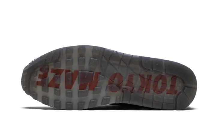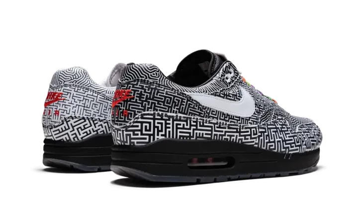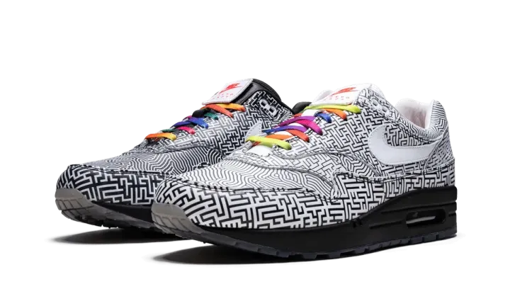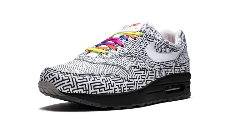 The Nike Air Max 1 "Tokyo Maze" is one of the special edition Air Max colorways from the "On Air" collection. In 2018, Nike invited locals from New York City, Paris, London, Shanghai, Seoul, and Tokyo to design their own colorways on an Air Max model of their choosing. The finalists were then chosen by the public, with one winning design from each city. Representing Tokyo is this eye-catching colorway of the Air Max 1 by Yuta Takuman. It features bold black and white maze graphics across the leather upper inspired by the labyrinthine design of Tokyo and its dense population. Tie-dye laces add a splash of color, while detachable "Tokyo Maze" tongue tags add another unique touch. "Tokyo Maze" text is also visible underneath the smoky translucent grey outsole. The Nike Air Max 1 "Tokyo Maze" from the "On Air" collection released on April 13, 2019.