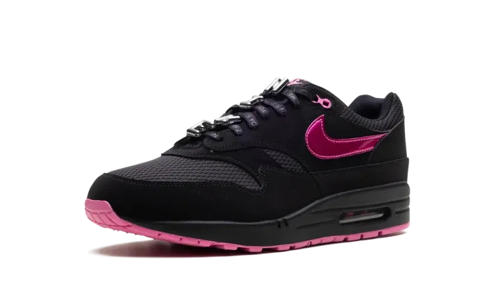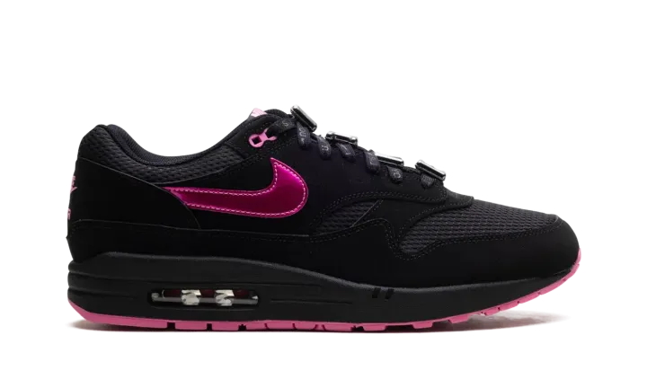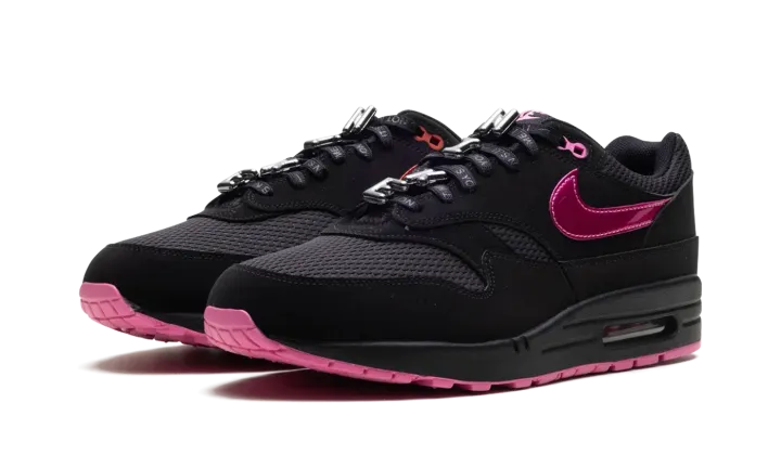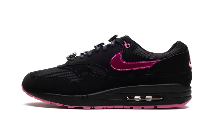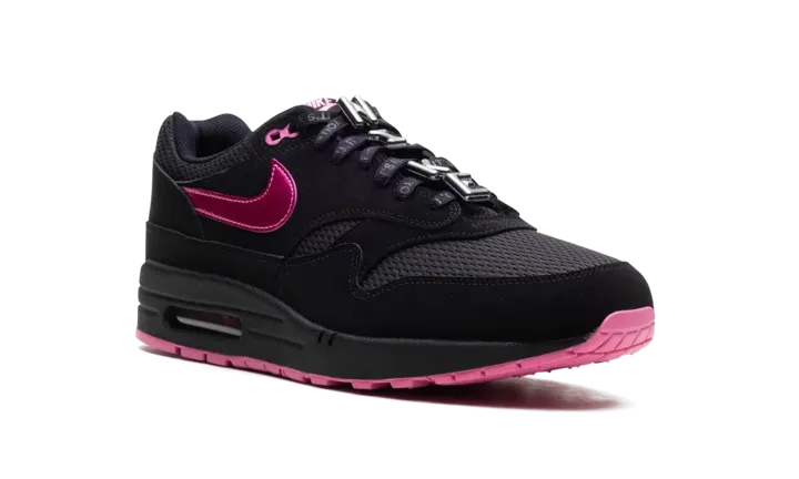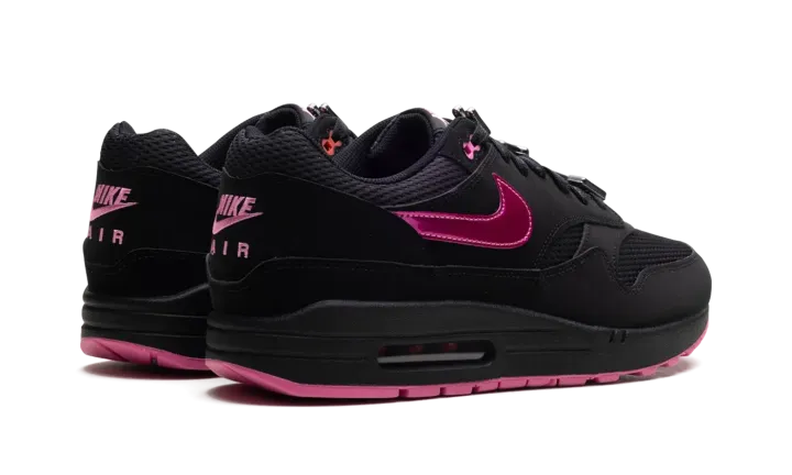 The Nike Air Max 1 PRM 'Valentine's Day Black', style code HV2302-001, is a special premium edition of the iconic Air Max 1, released as part of a Valentine's Day-themed collection. It features a dark, romantic color scheme with witty, playful details.
