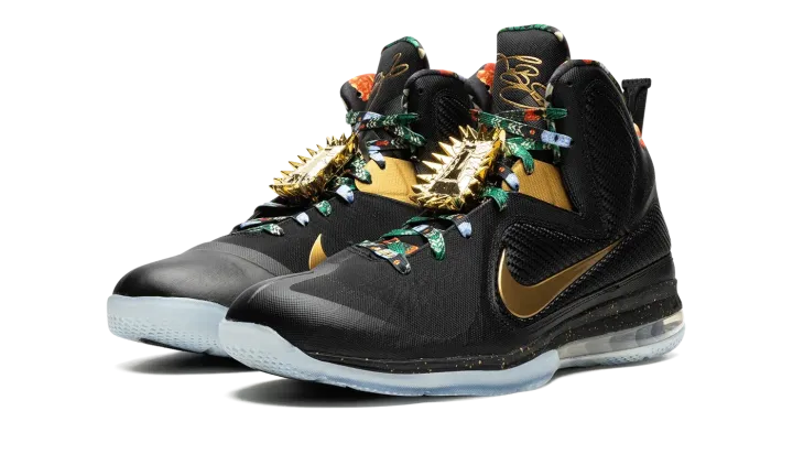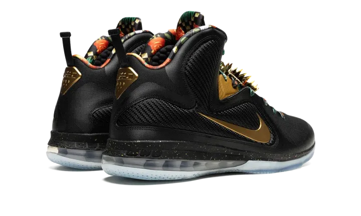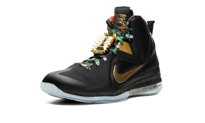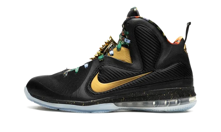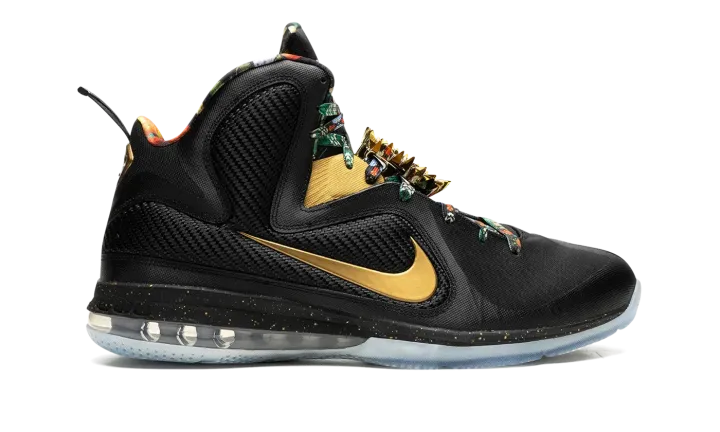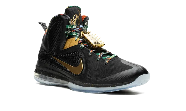 The Nike LeBron 9 "Watch the Throne 2022" is the modern re-release of the popular colorway of LeBron James's ninth signature shoe with Nike Basketball. This colorway was originally a "Friends & Family" colorway of the performance basketball shoe created exclusively for LeBron and close family and friends. The "Watch the Throne" LeBron 9 is inspired by Jay-Z and Kanye West's 2011 "Watch the Throne" studio album, specifically its luxurious album artwork, which was designed by fashion designer Riccardo Tisci. The shoe was given a general retail release for the first time ever in January 2022. Details include a Metallic Gold Swoosh on either side of the black Hyperfuse upper, which is stabilized with interior Flywire cables and textile wings. Both the interior lining and laces have a premium-inspired multicolor design. LeBron James's signature appears in gold on the top of the tongue and gold-plated lace "jewels" are found on the mid-section of the tongue, partially obscuring the laces. Additional gold accenting is found in a speckle-like finish on the black foam midsole above the 180-degree Max Air cushioning unit underfoot. Release date: Release date: January 6, 2022